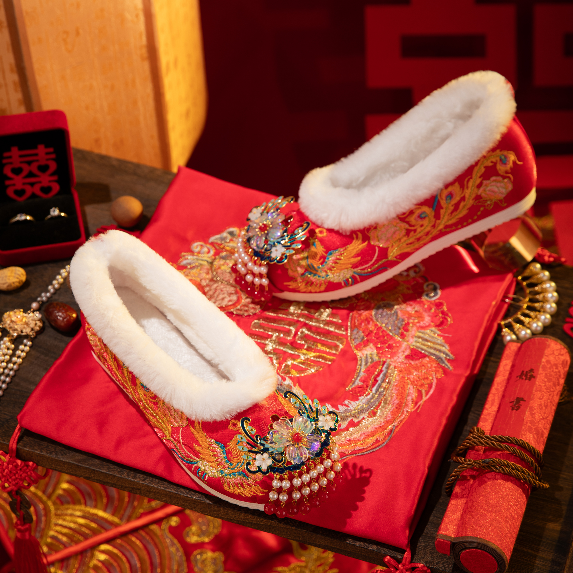 女冬季 明制汉服婚鞋 新款 婚礼新娘鞋 绝美凤凰流苏中式 红色秀禾婚鞋