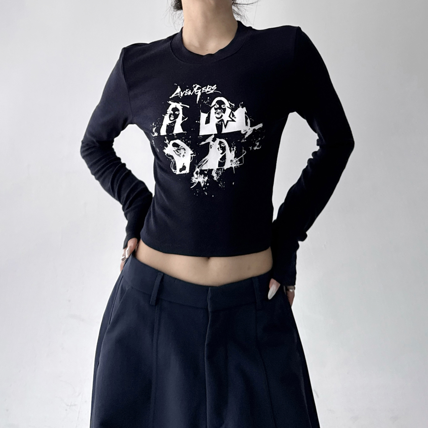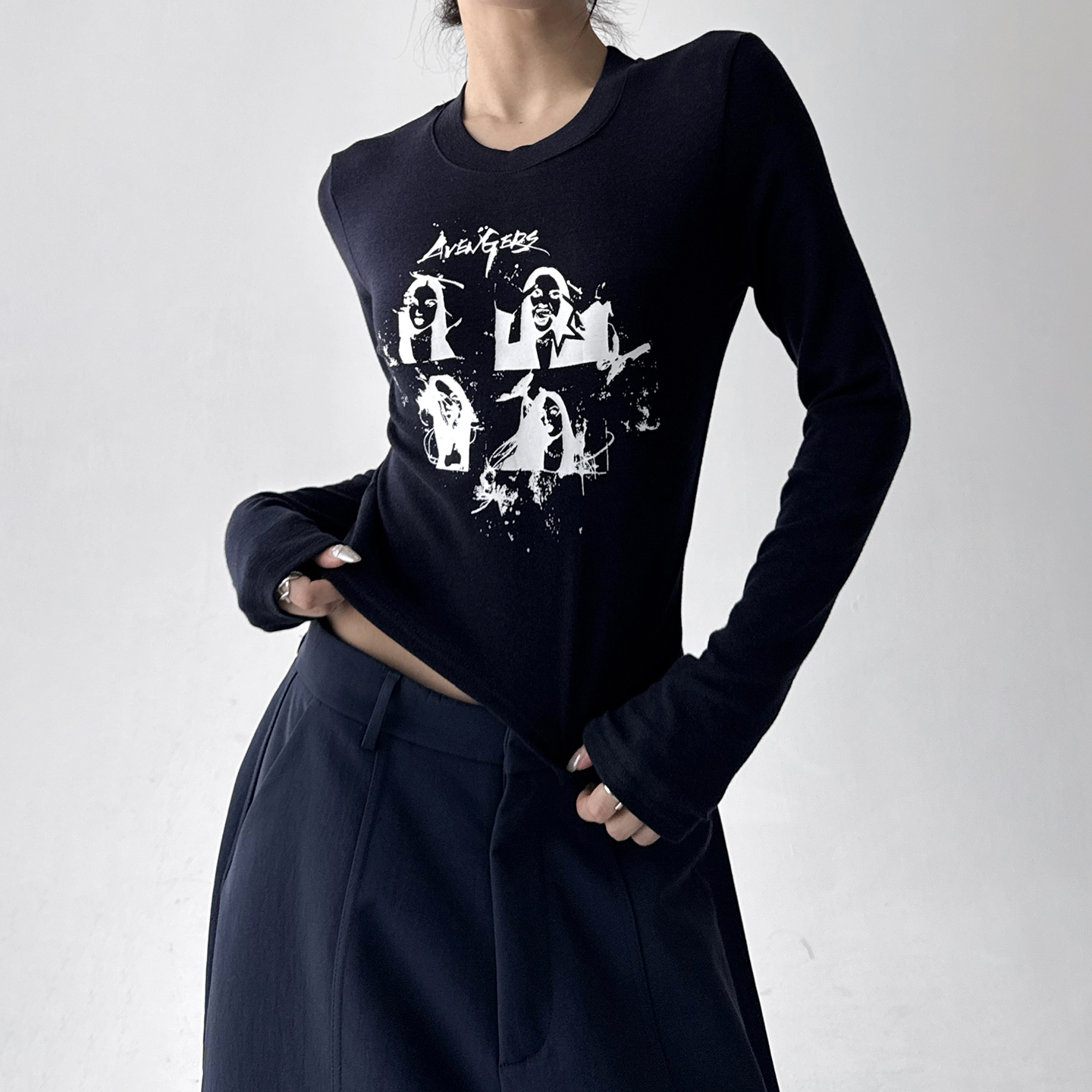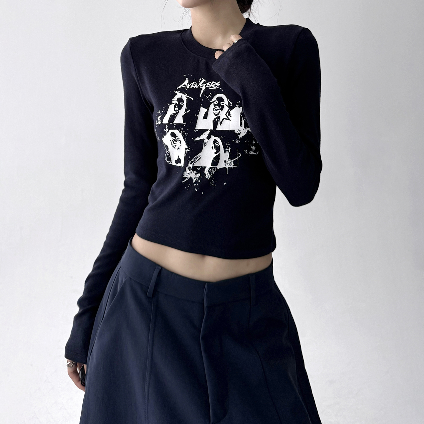 t恤2025秋冬韩版 长袖 修身 紧身涂鸦印花个性 美式 打底衫 辣妹短款