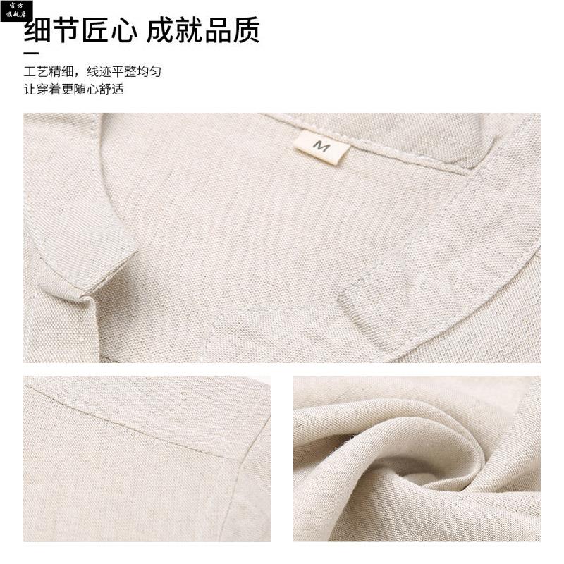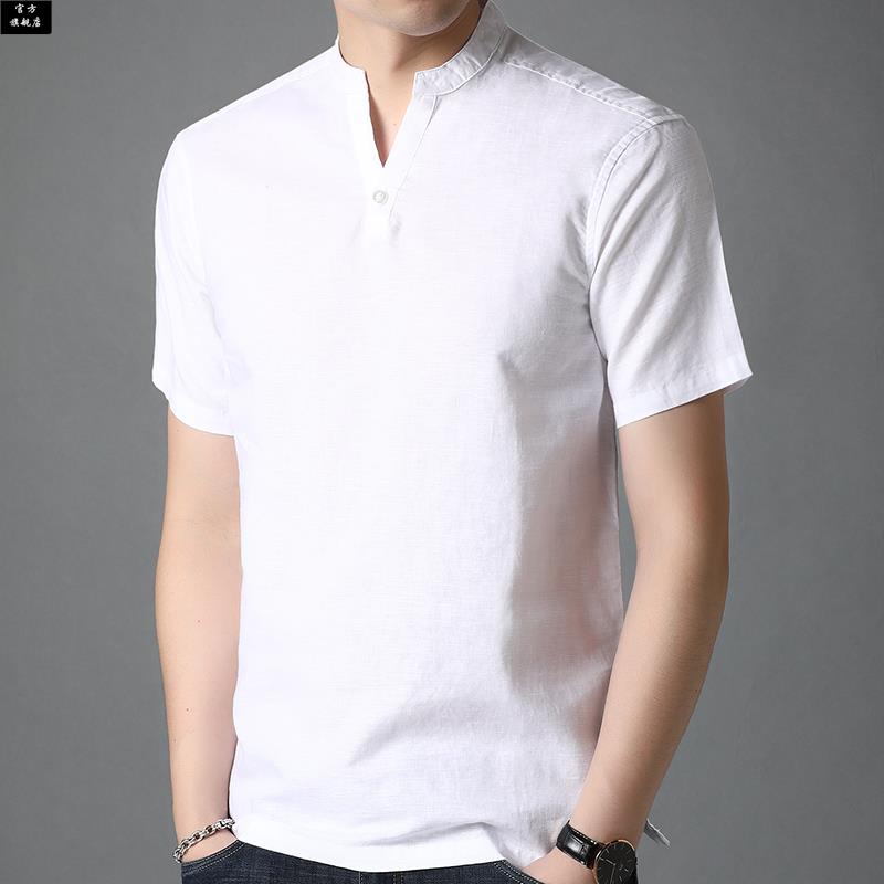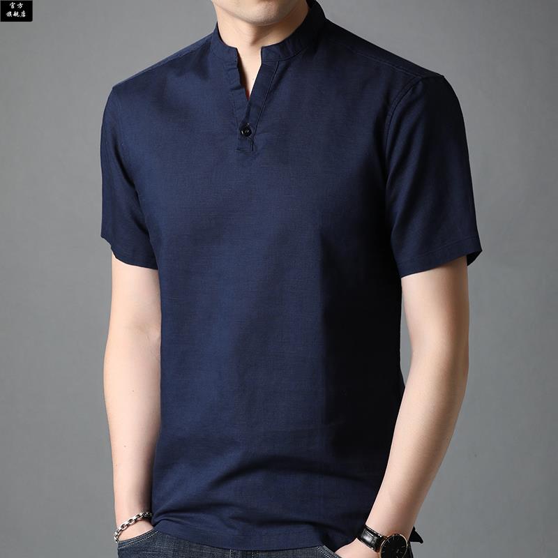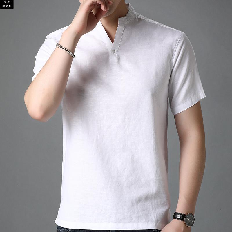 棉麻中国风休闲男装 t恤男无领立领薄款 麻 v领亚麻短袖 保罗官方夏季