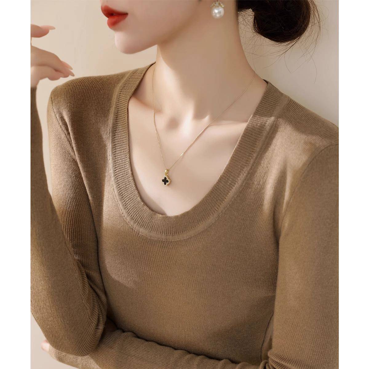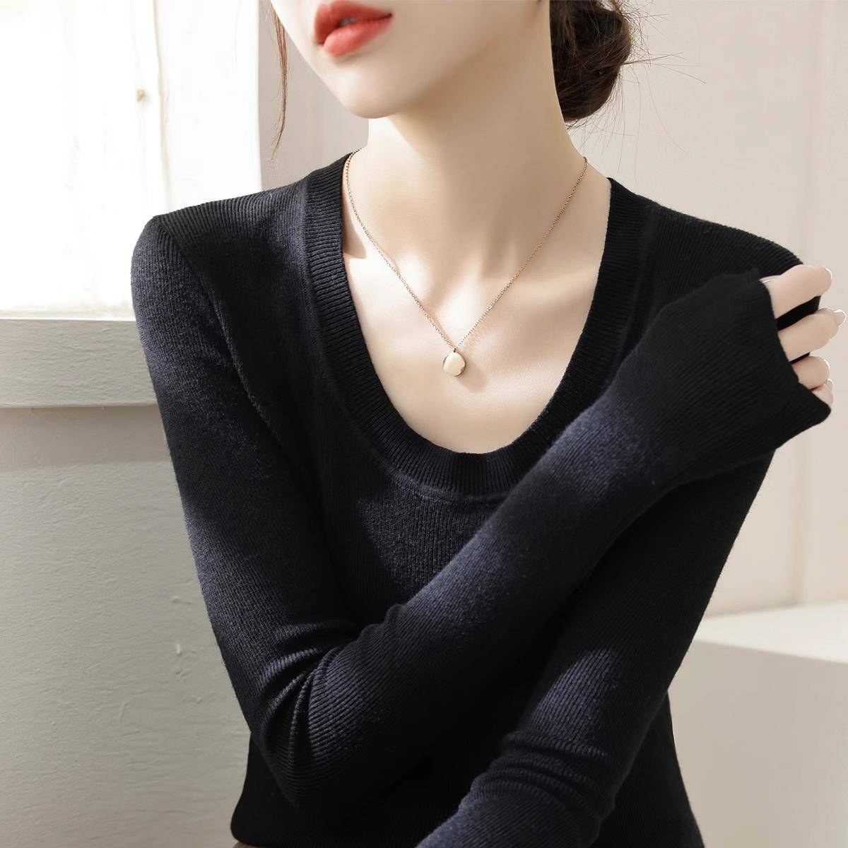 内搭显瘦气质低圆领上衣1010c 修身 米杏色U领针织打底衫 女新款