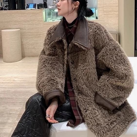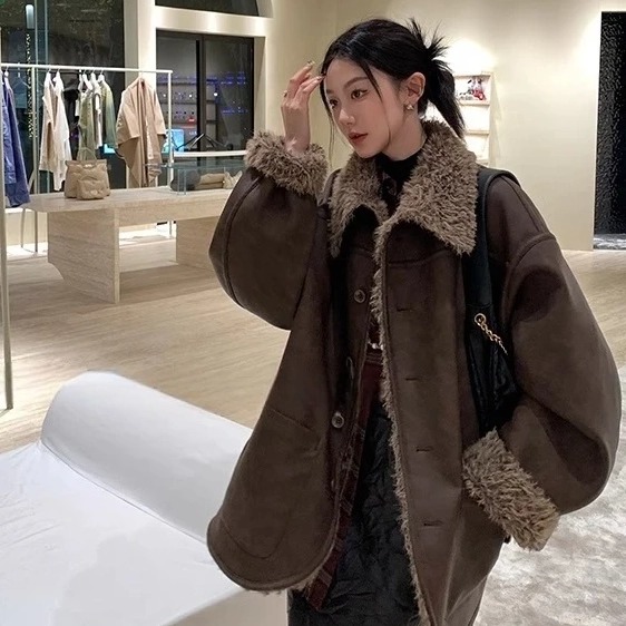 复古风双面穿皮毛一体外套女2025秋冬季 宽松百搭羊羔毛加厚外套潮