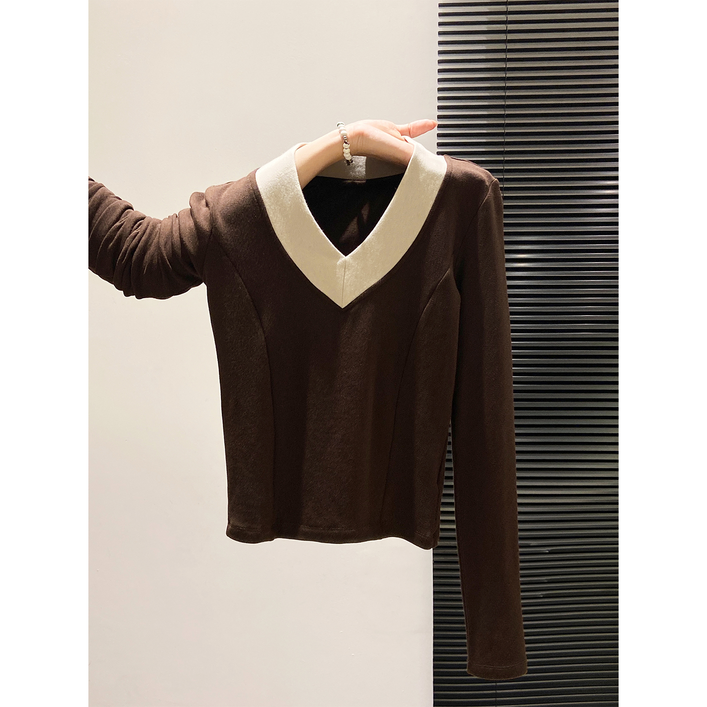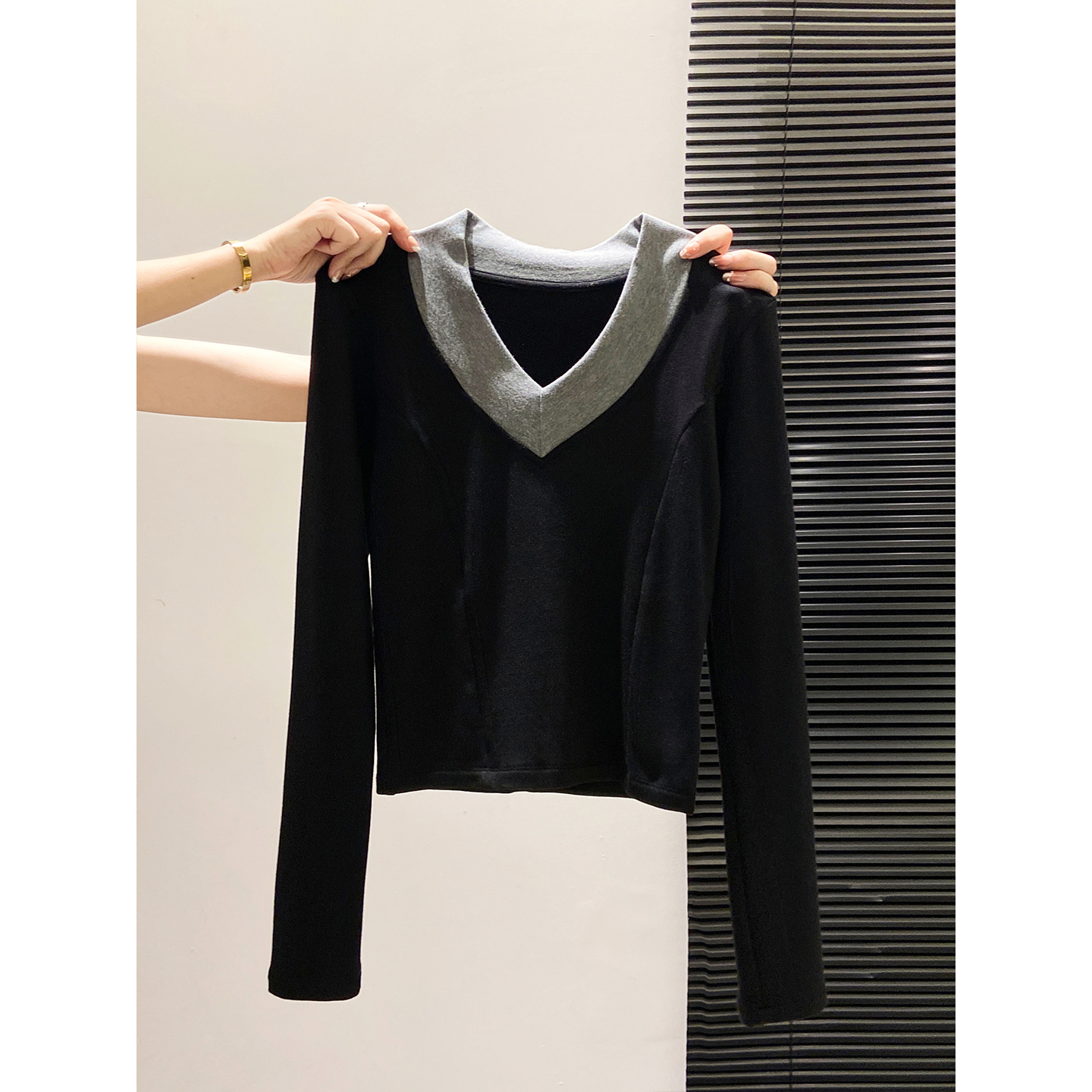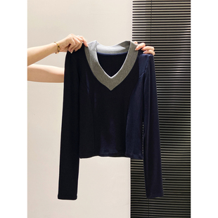 修身 美式 新款 t恤女2025秋季 显瘦正肩内搭打底上衣 辣妹撞色V领长袖