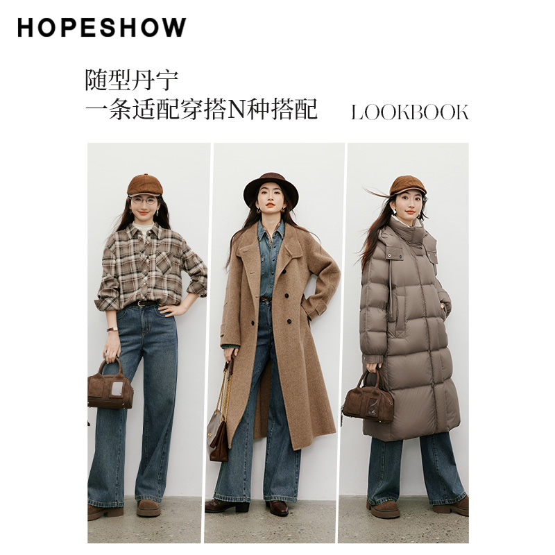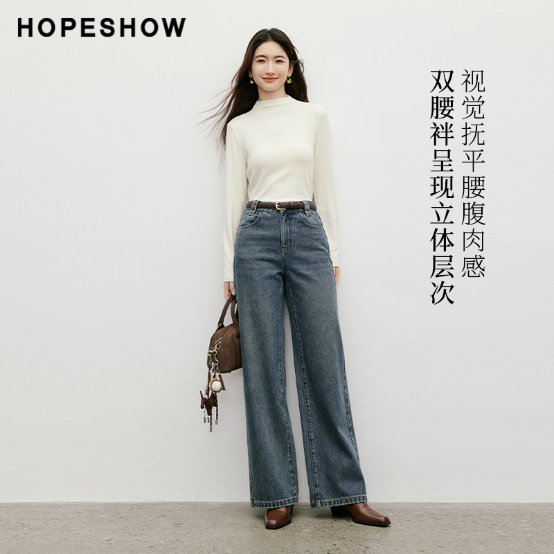 女装 2025冬新款 红袖 复古水洗磨白磨毛阔腿牛仔长裤 会员专享