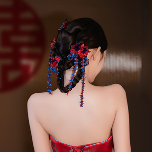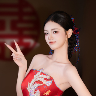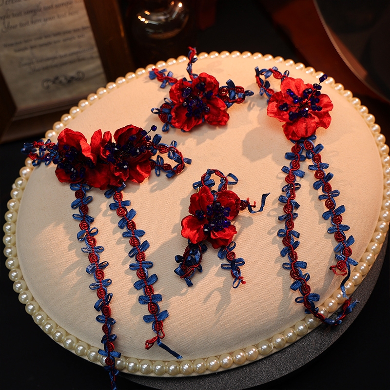 小众新娘气质红蓝撞色订婚结婚敬酒服头饰新中式 晨袍跟妆拍照配饰