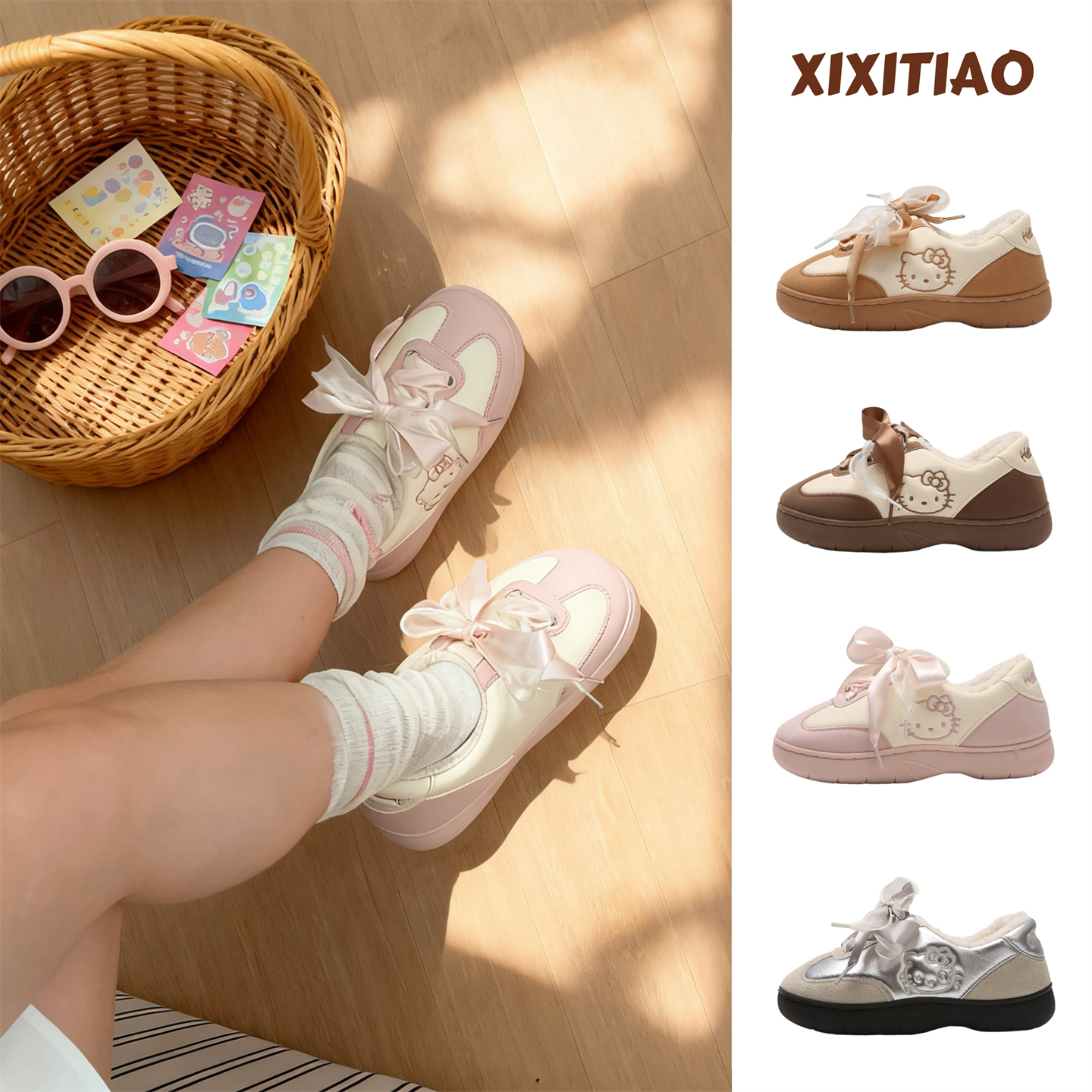 HelloKitty德训鞋 细细条 冬防滑甜美蝴蝶结女正版 小白鞋 加绒板鞋