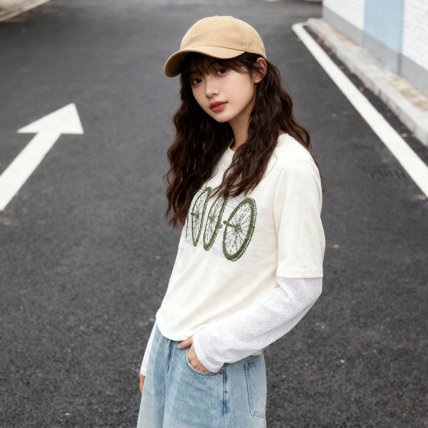 上衣 女百搭时尚 ROCOCO 洛可可2025假两件宽松车轮印花圆领针织衫