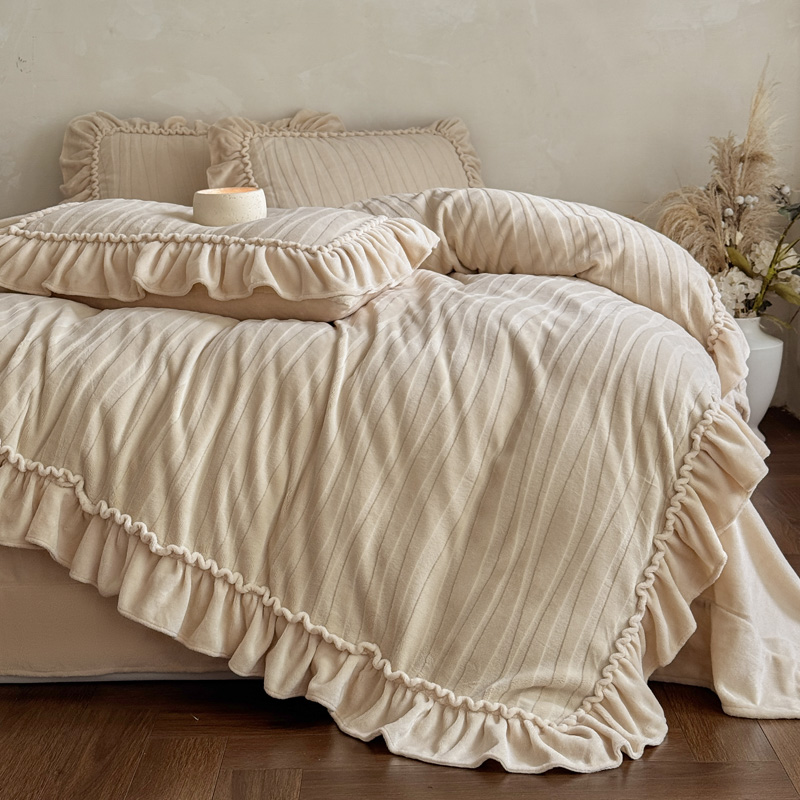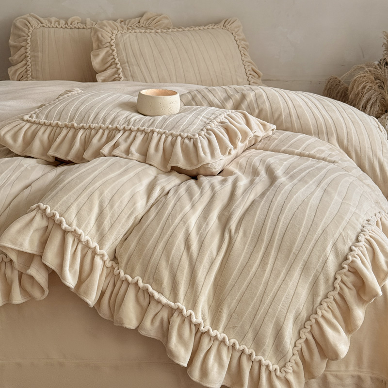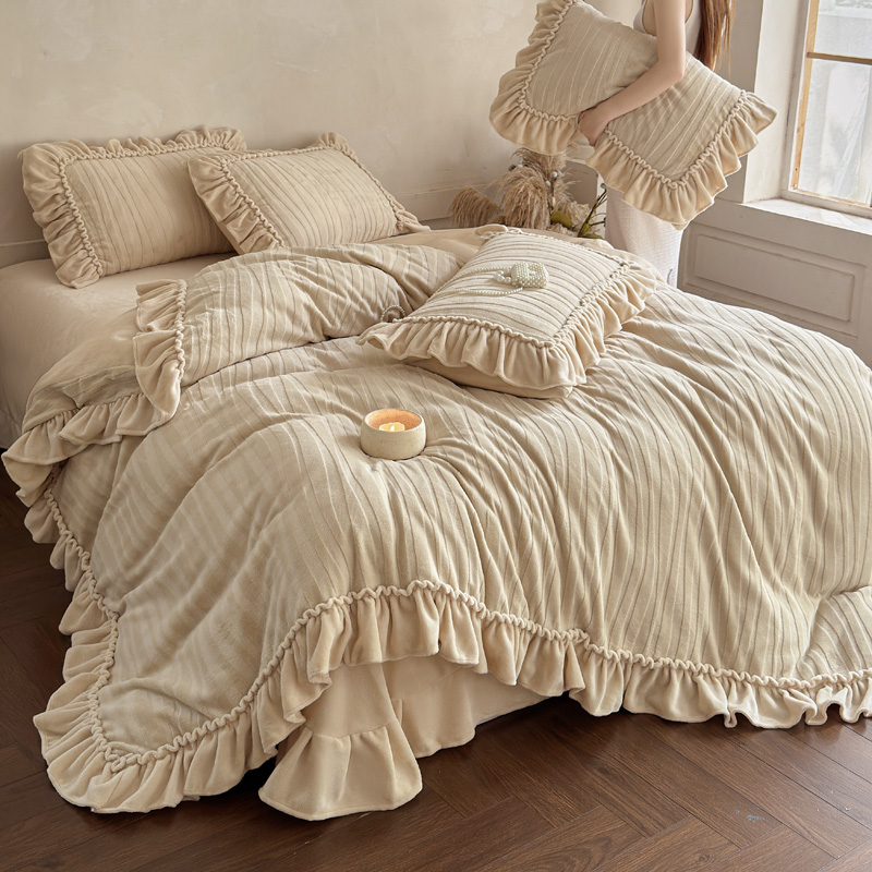 冬季 牛奶绒雕花花边四件套公主风主卧室a类母婴级防静电纯色被套