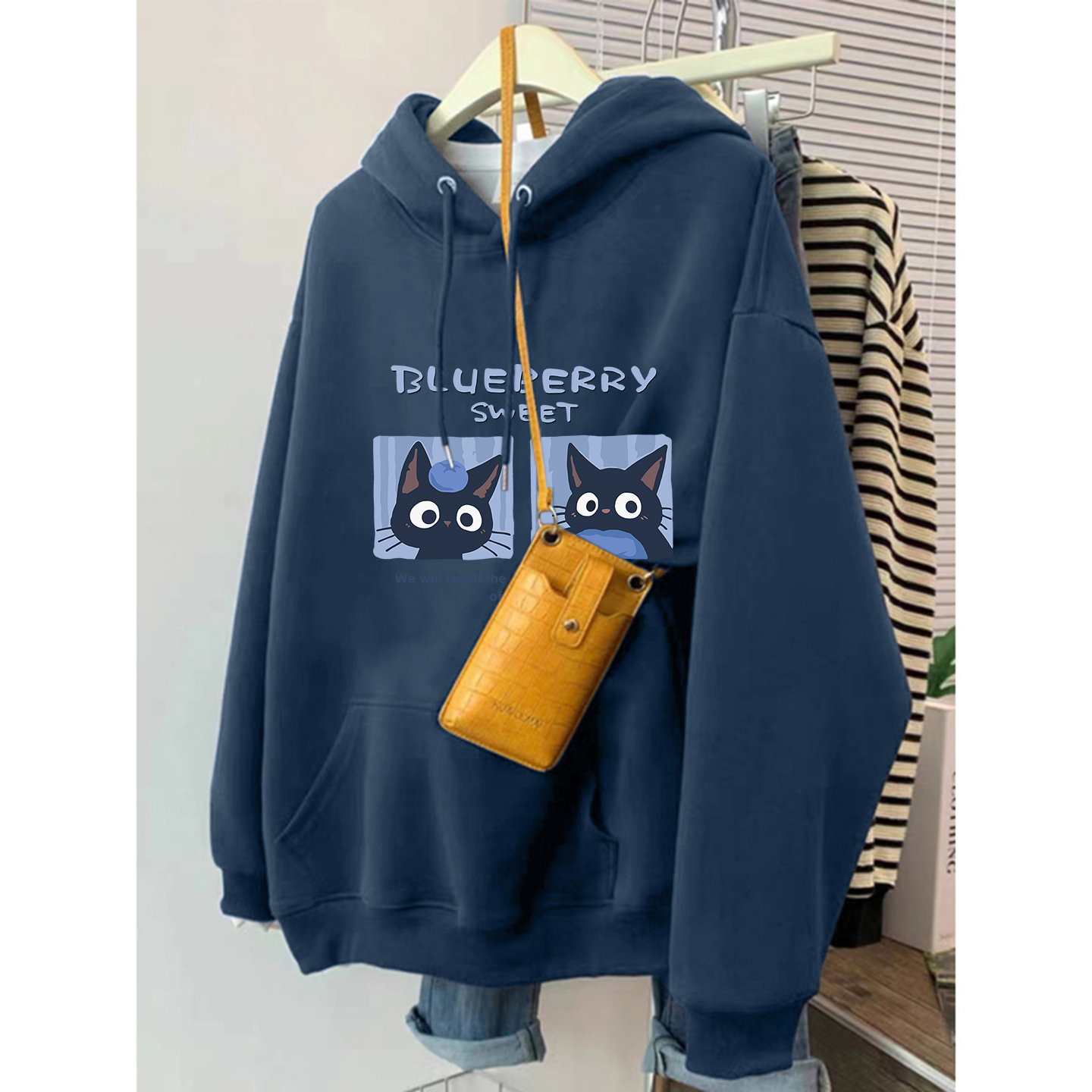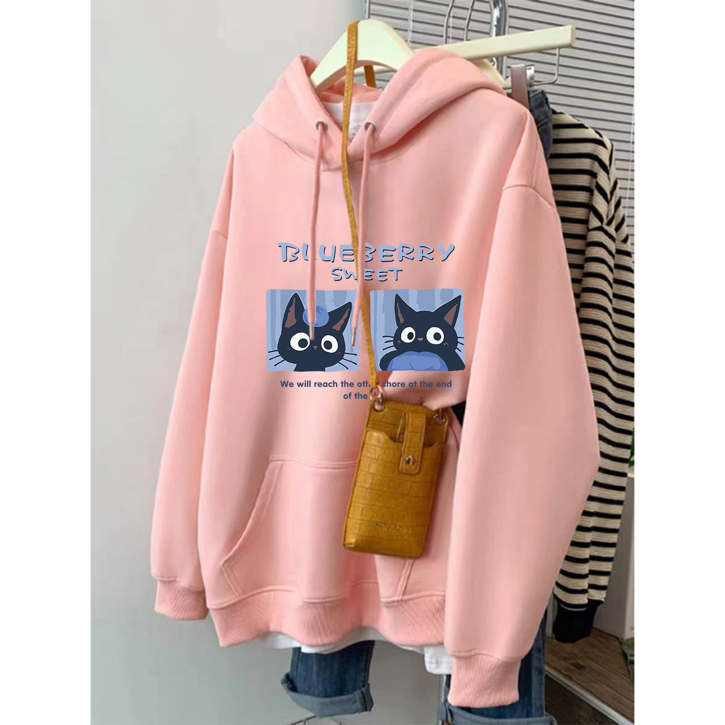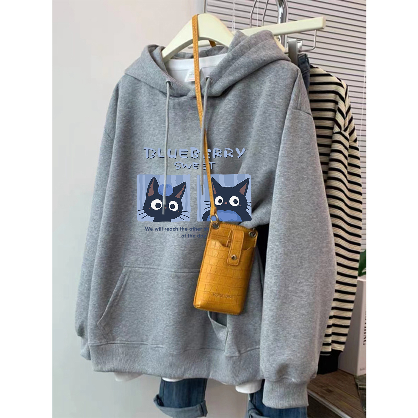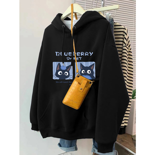 大码 慵懒风上衣 胖mm卡通风酒红色加绒连帽卫衣女猫咪印花宽松韩版