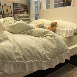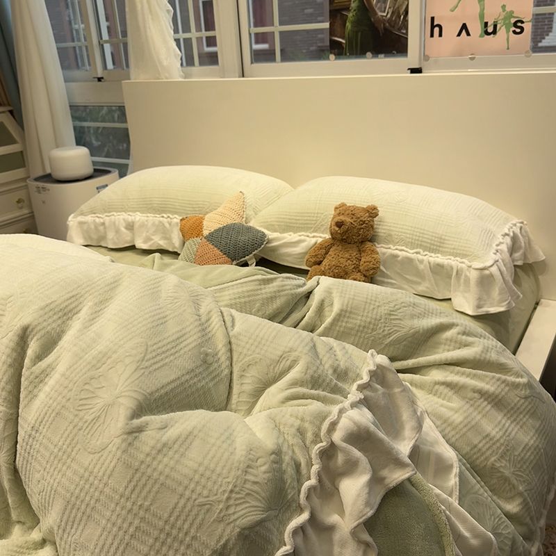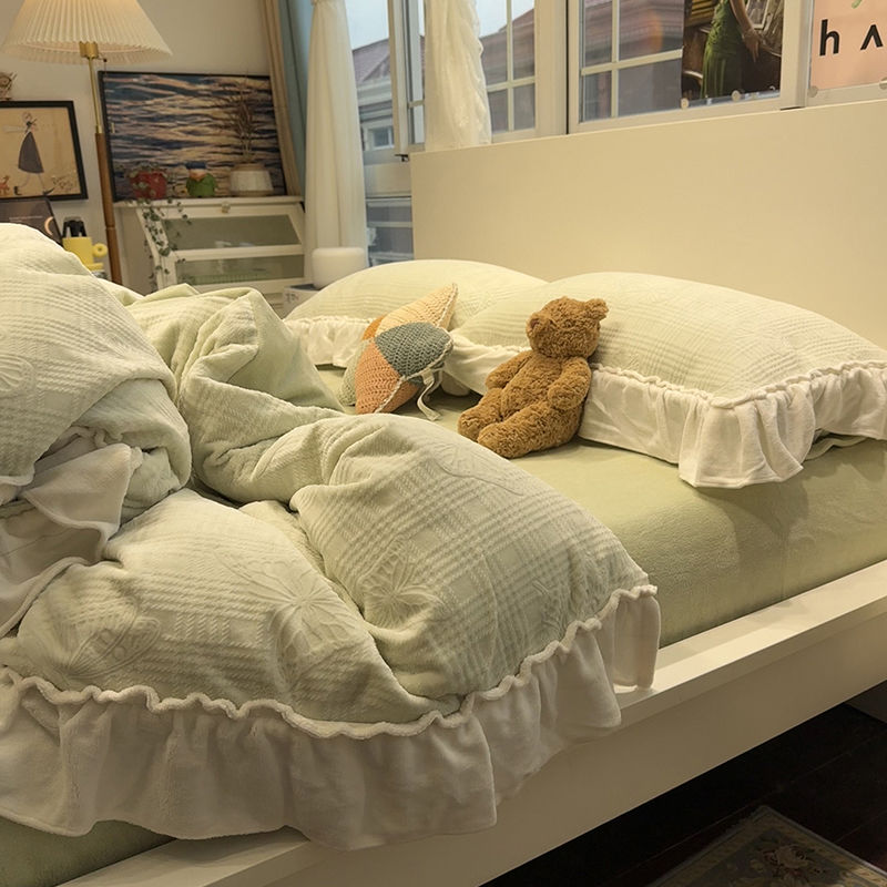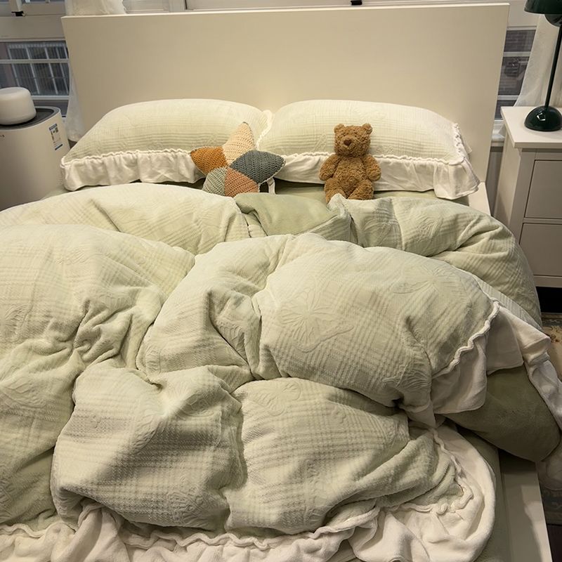 保暖加厚绿花边雕花牛奶绒床上四件套珊瑚绒被套法莱绒床单三件套