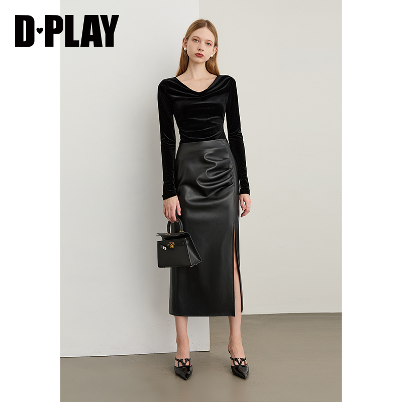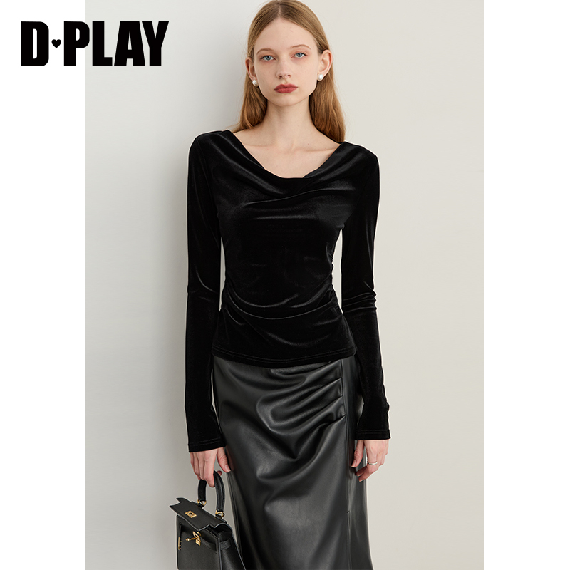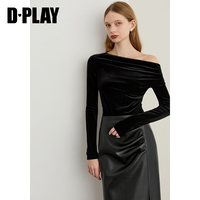 长袖 DPLAY2025年秋季 气质打底衫 黑色t恤女好看一字肩时尚 上衣 新款