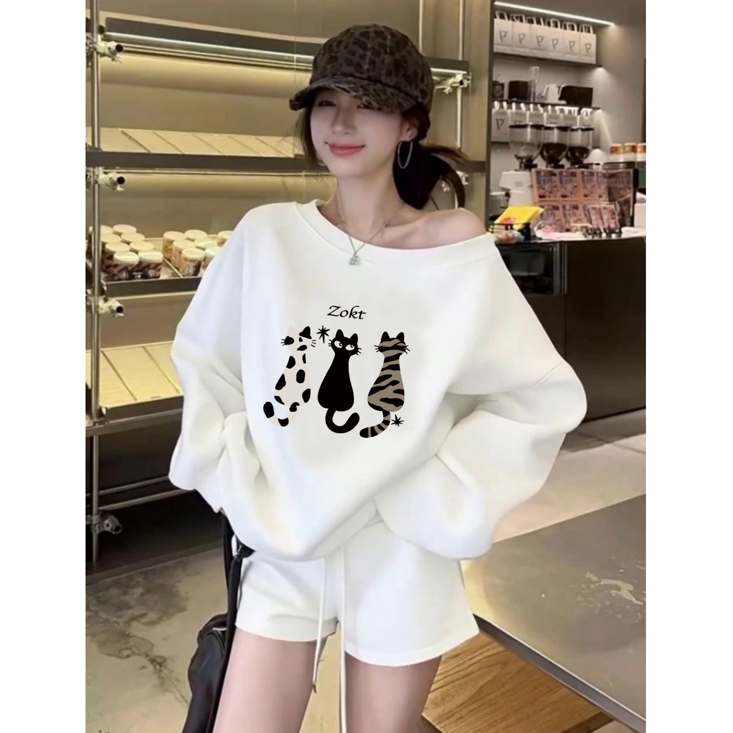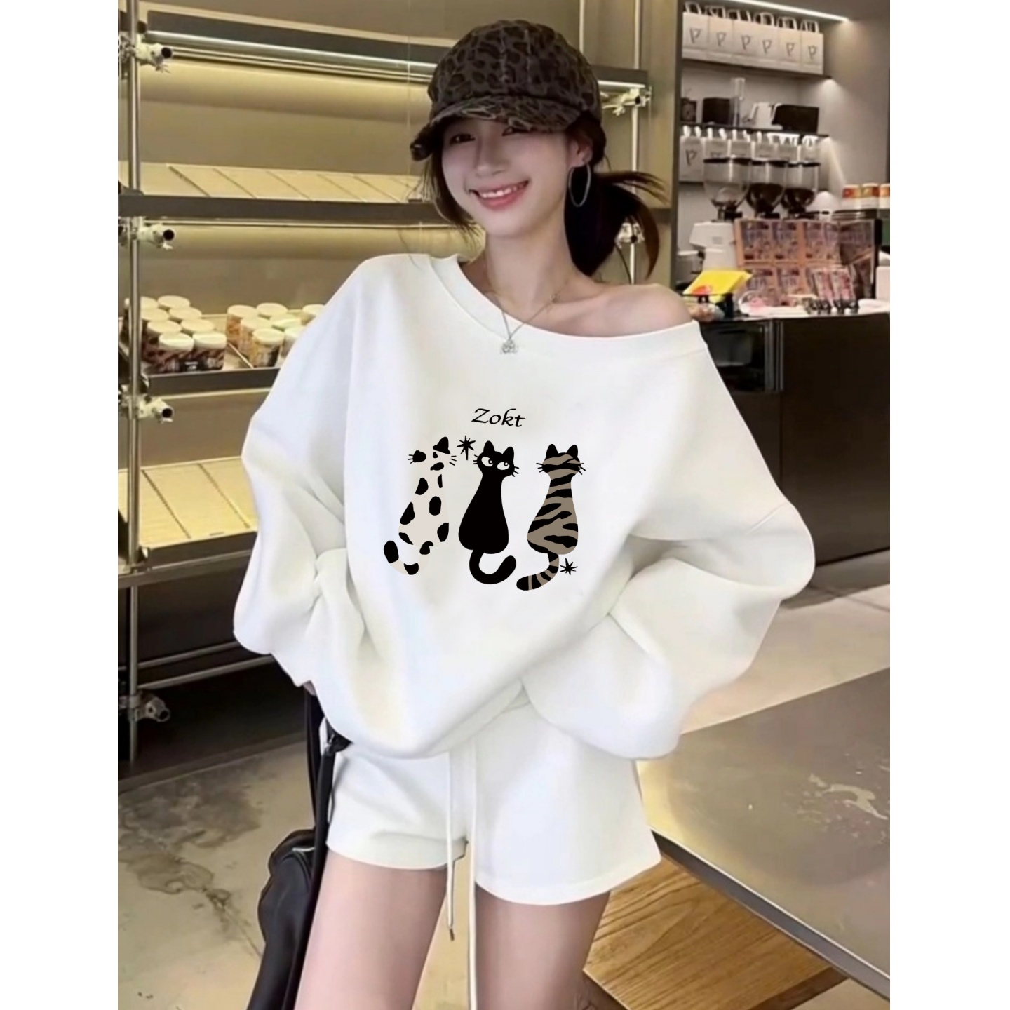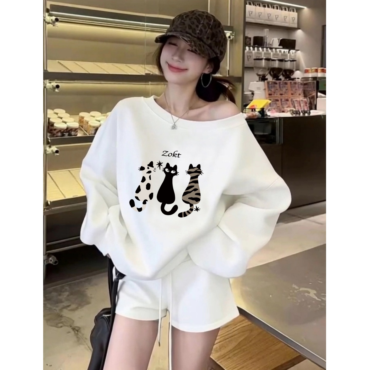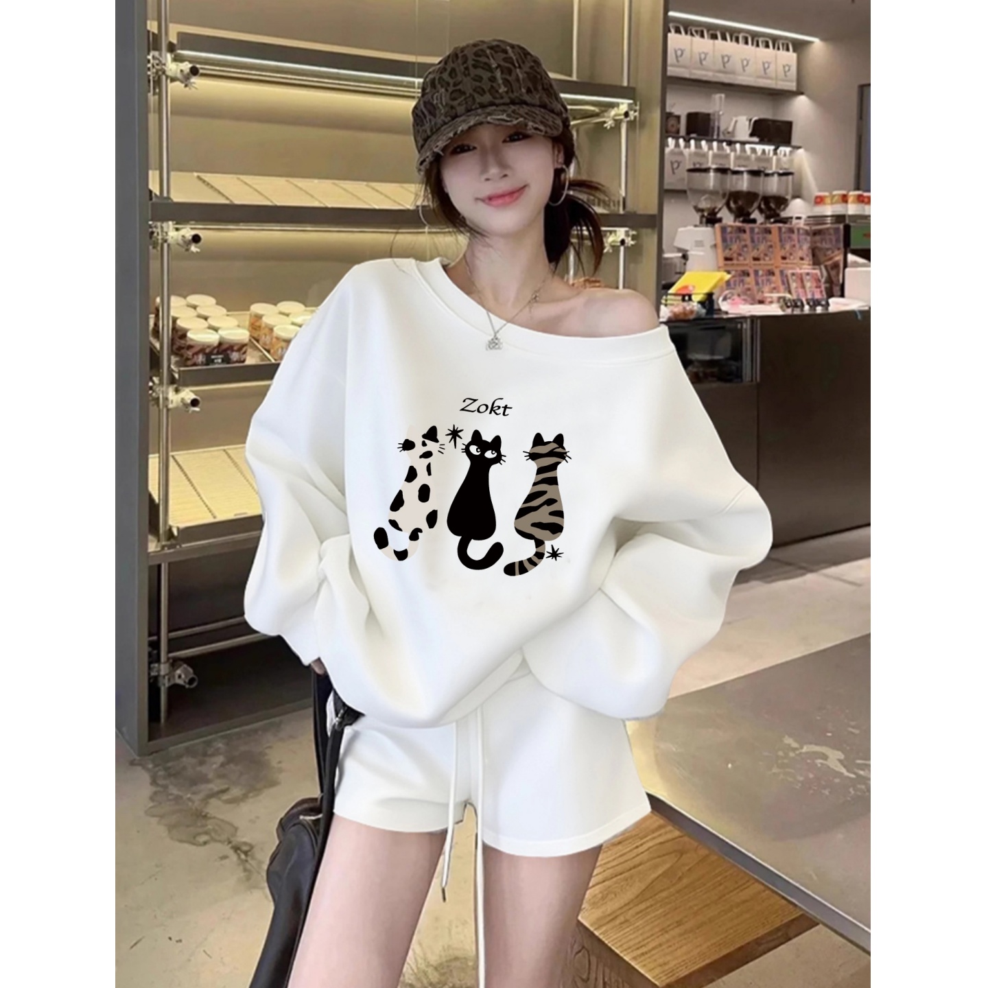 宽松百搭休闲薄款 卡通猫咪印花斜领韩版 露肩卫衣 时尚 2025早秋新款