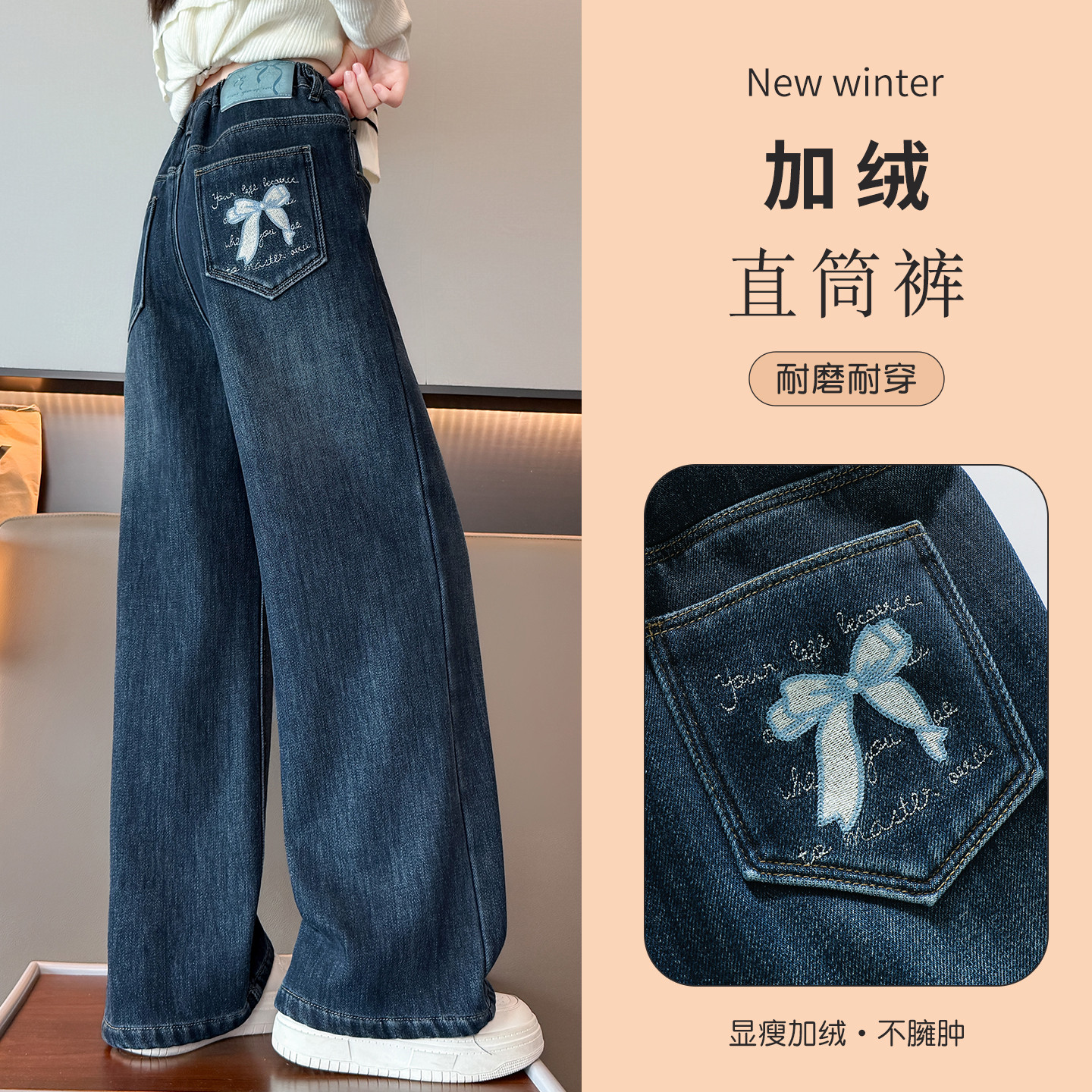 子儿童直筒阔腿裤 女童加绒牛仔裤 加厚裤 秋冬款 中大童宽松 2025新款