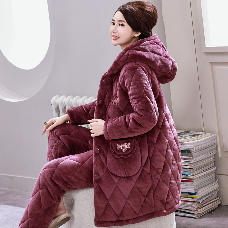 法兰绒家居服套装 睡衣女秋冬季 三层加厚珊瑚绒夹棉袄加绒保暖新款