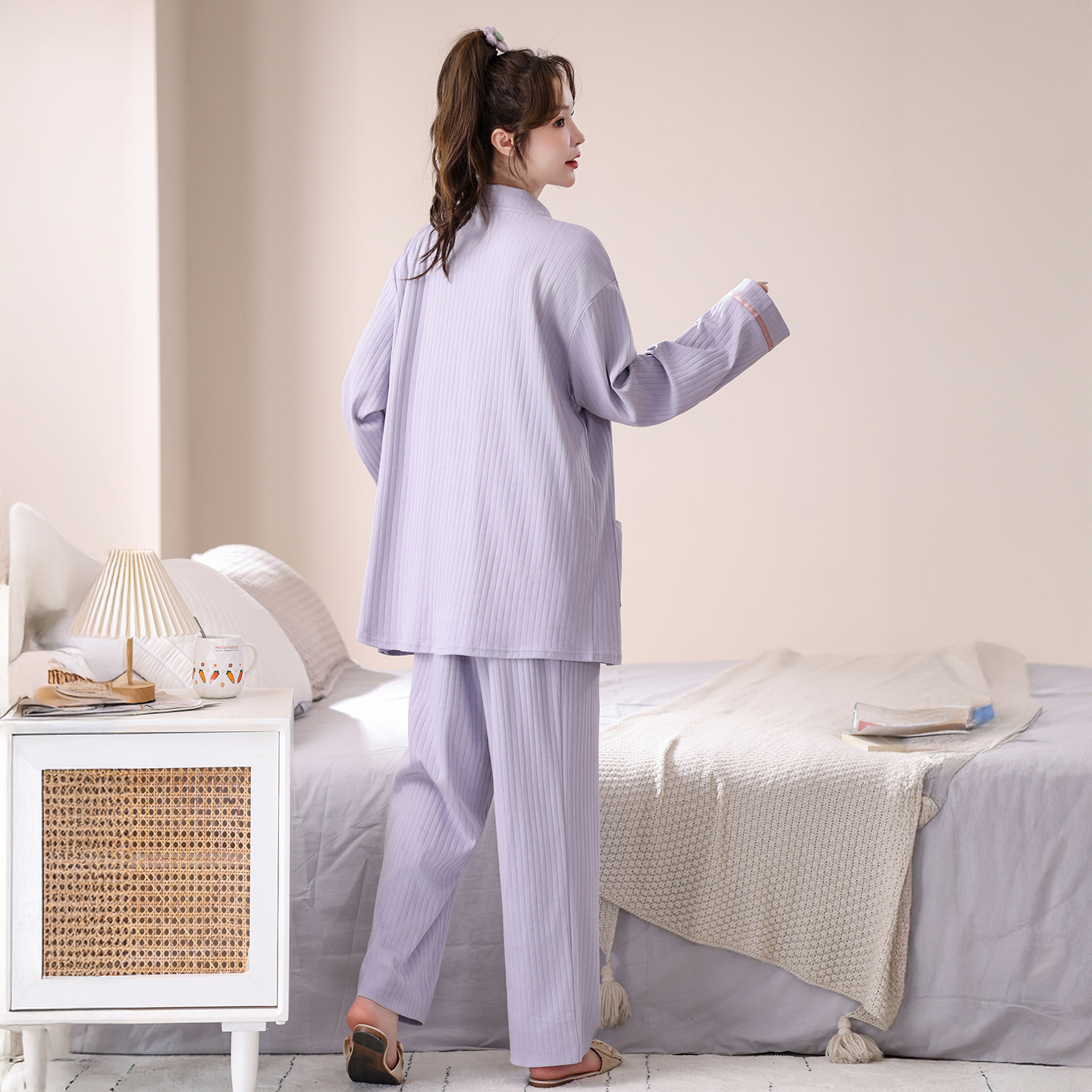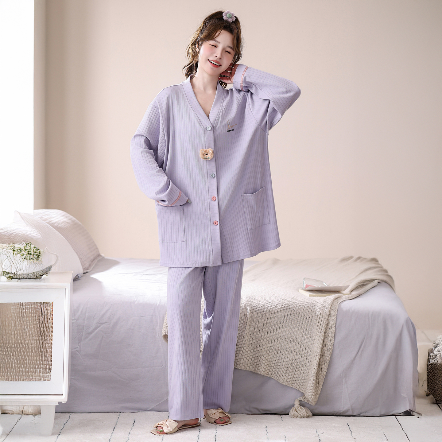 胖mm200斤高级感日系v领孕妇妈妈家居服 长袖 大码 纯棉睡衣女秋冬季