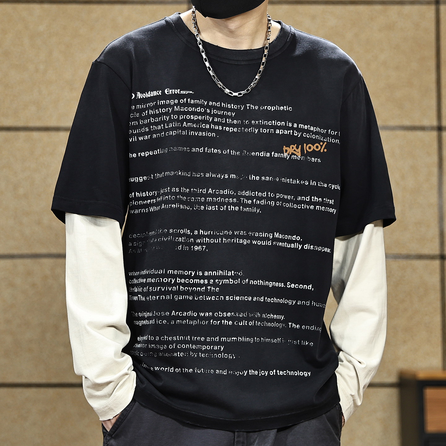 秋季 t恤男款 高街潮牌水洗磨破做旧宽松上衣男 复古假两件长袖 美式