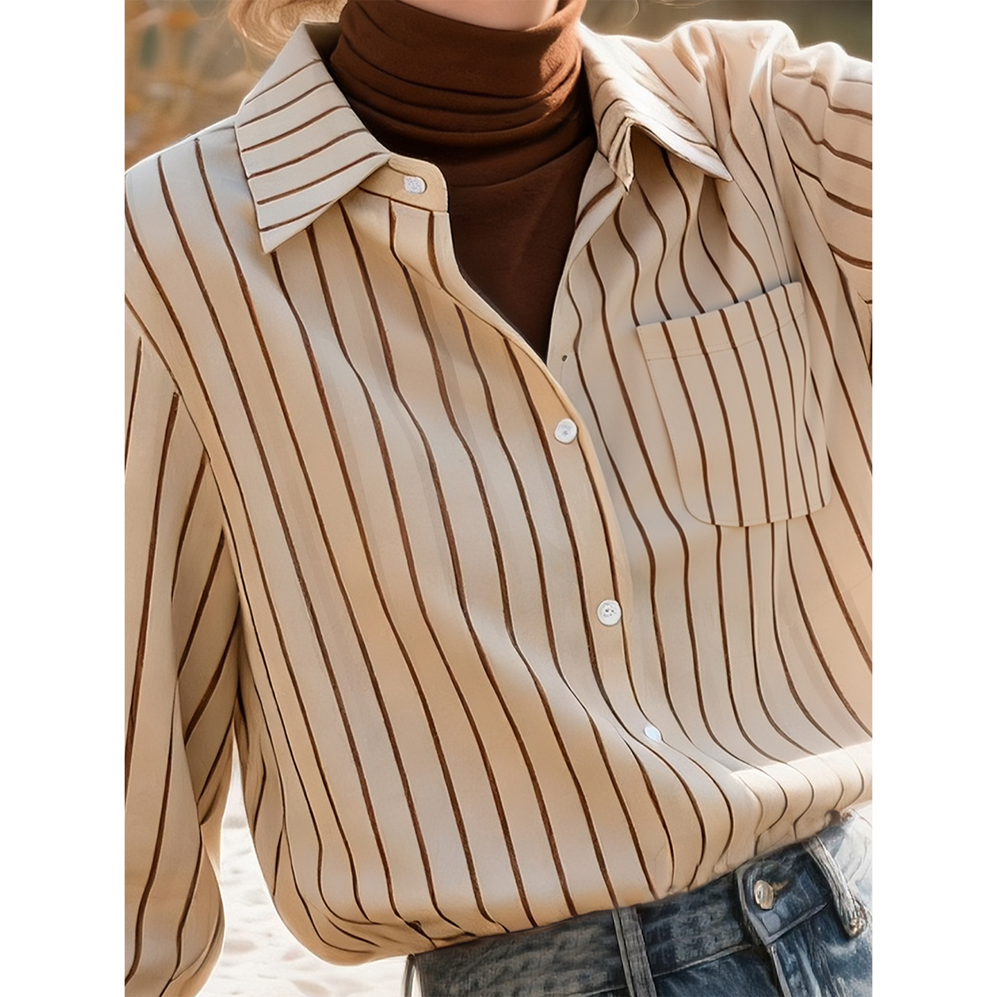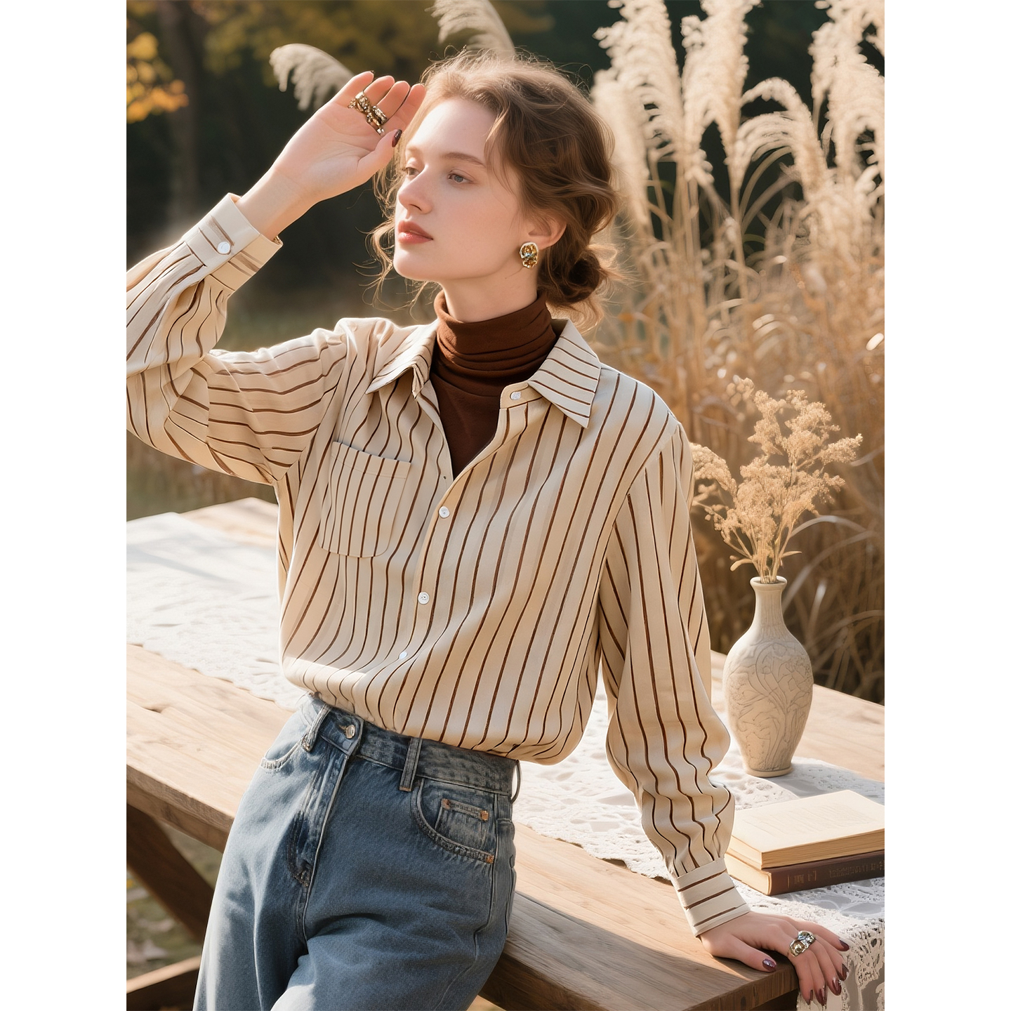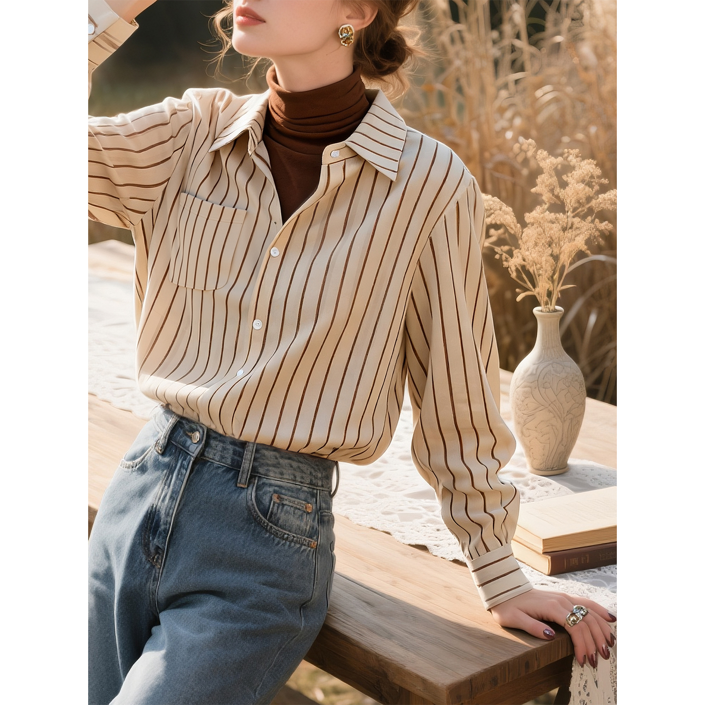 经典 新款 百搭通勤风简约上衣 女2025秋装 秋水伊人翻领蓝色条纹衬衫