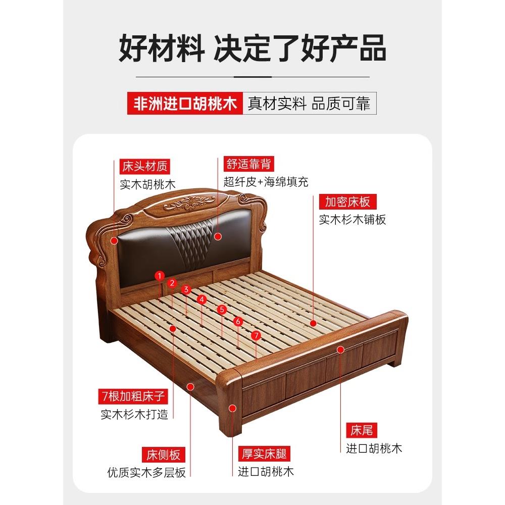 新中国风胡桃实木床1.8米双人床主卧室家庭1.5米加厚软包装 高盒子