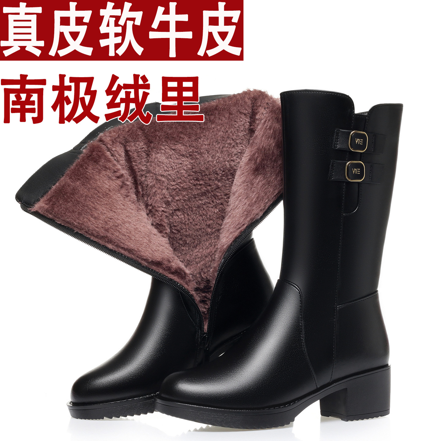 皮毛一体靴子 粗跟羊毛皮鞋 中老年皮靴女中筒靴妈妈鞋 加绒保暖棉鞋