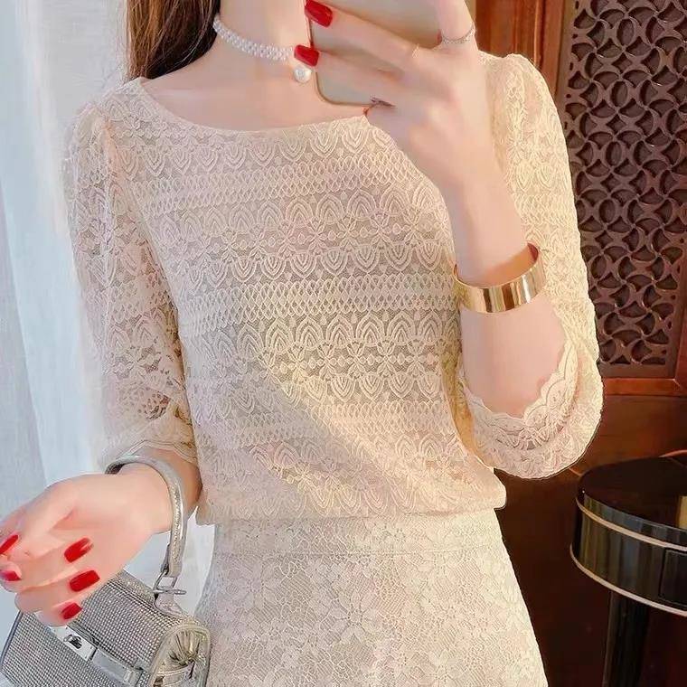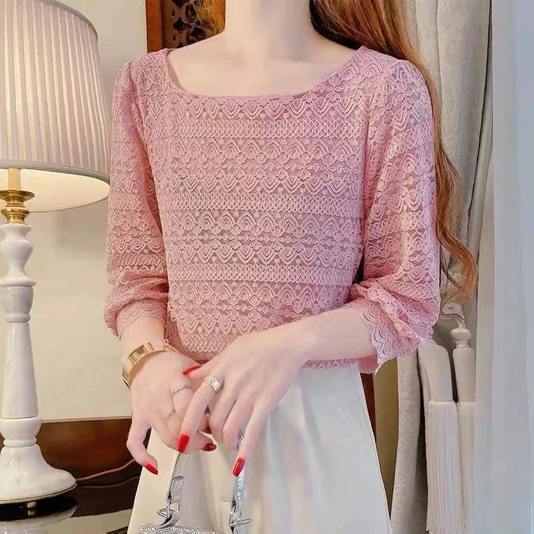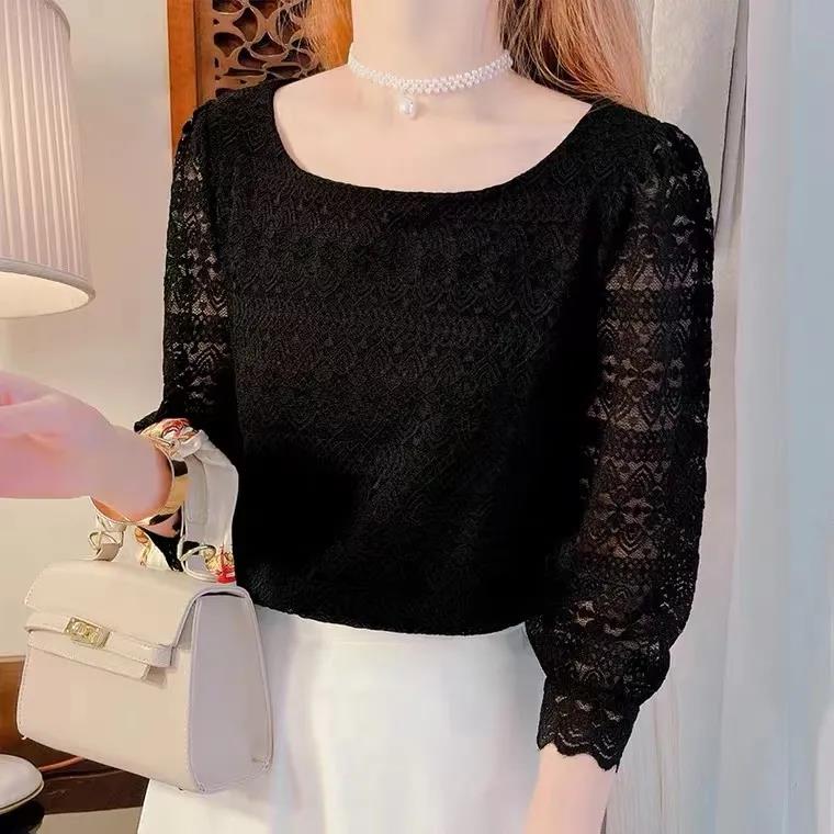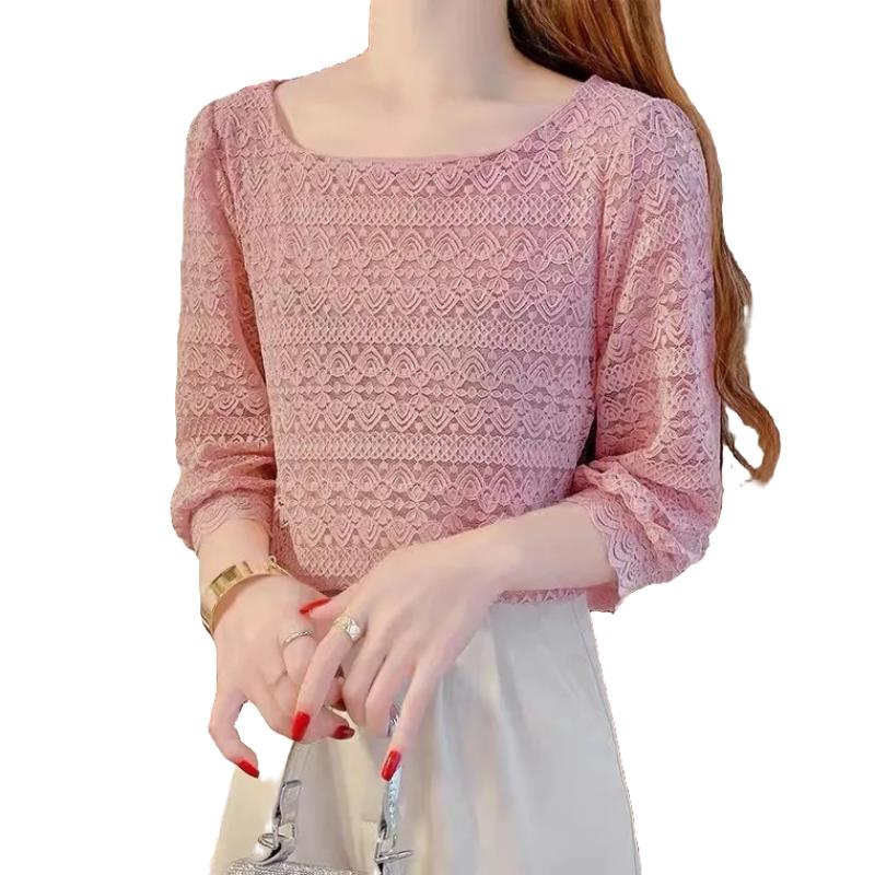1007k T恤女气质透气感小衫 秋冬打底内搭2025新款 方领蕾丝七分袖