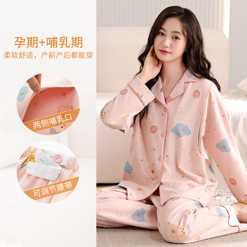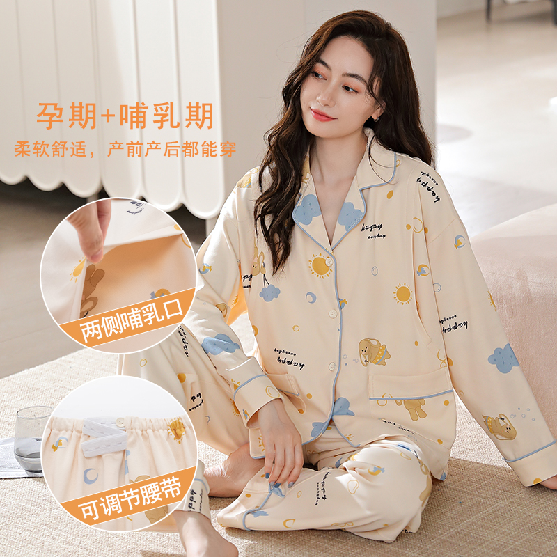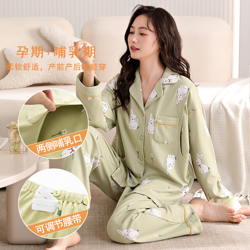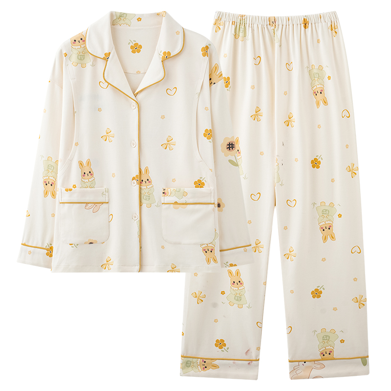 套装 翻领高级可外穿家居服大码 长袖 猫人纯棉睡衣女带胸垫秋冬新款