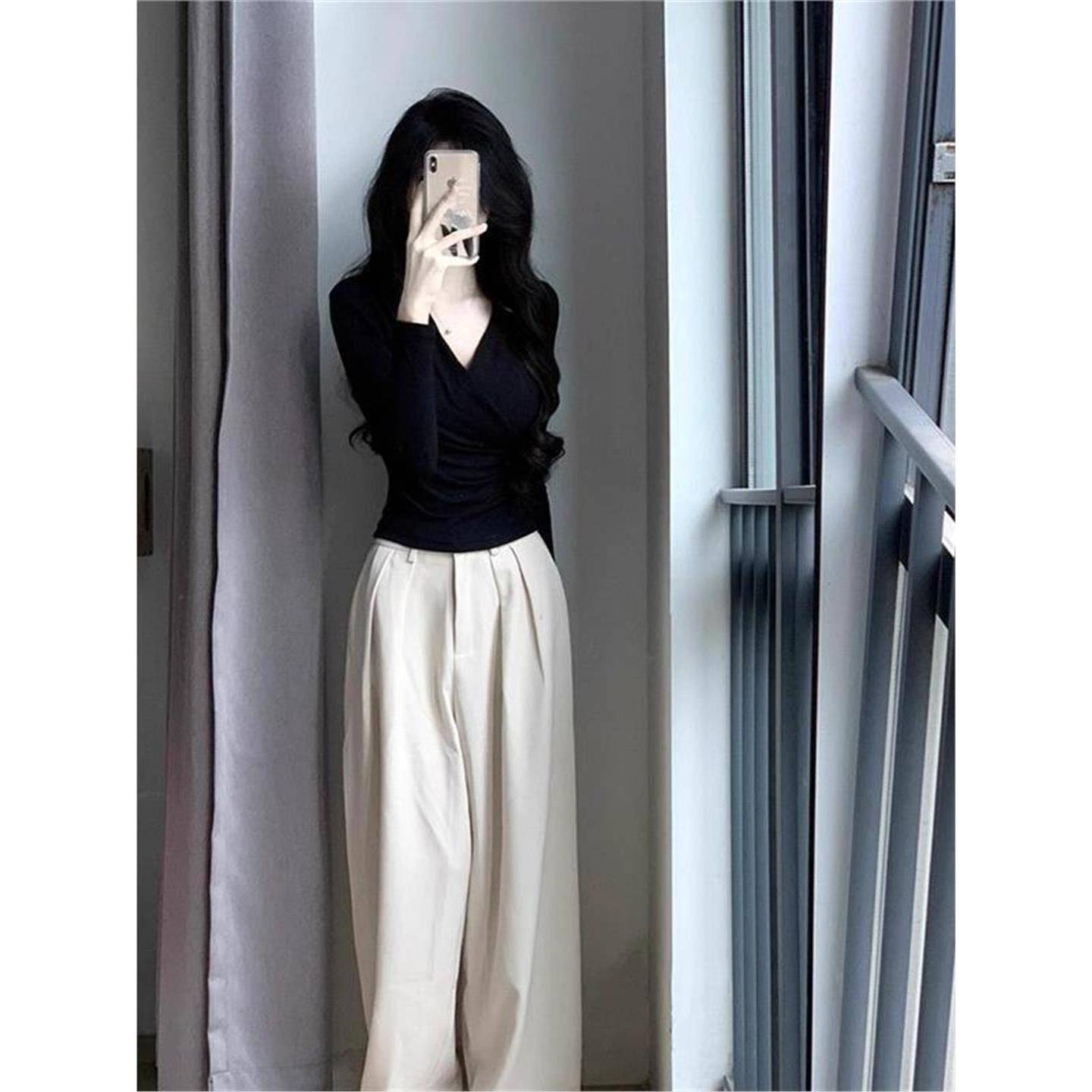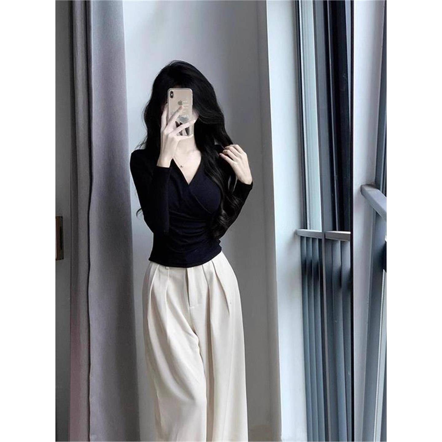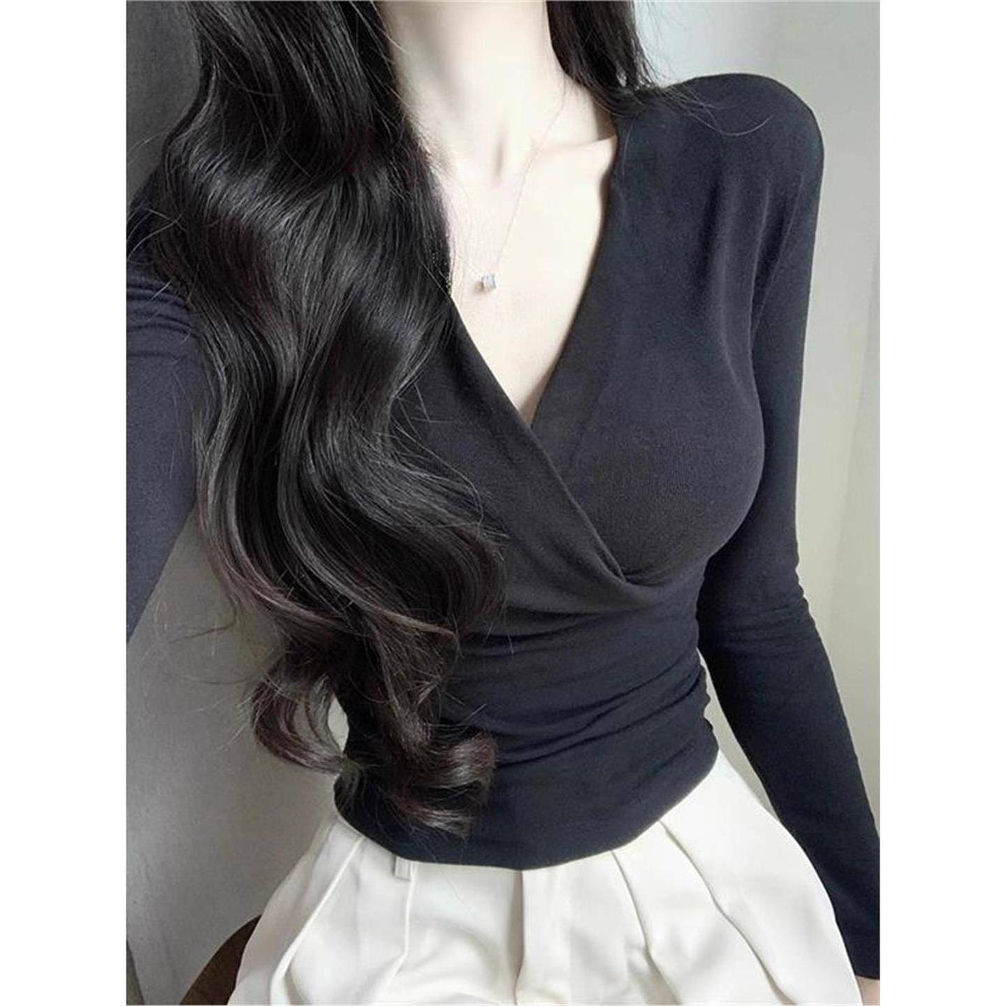 显瘦掐腰辣妹欲上1007k 衫 秋冬打底内搭黑色交叉V领长袖 T恤女修身