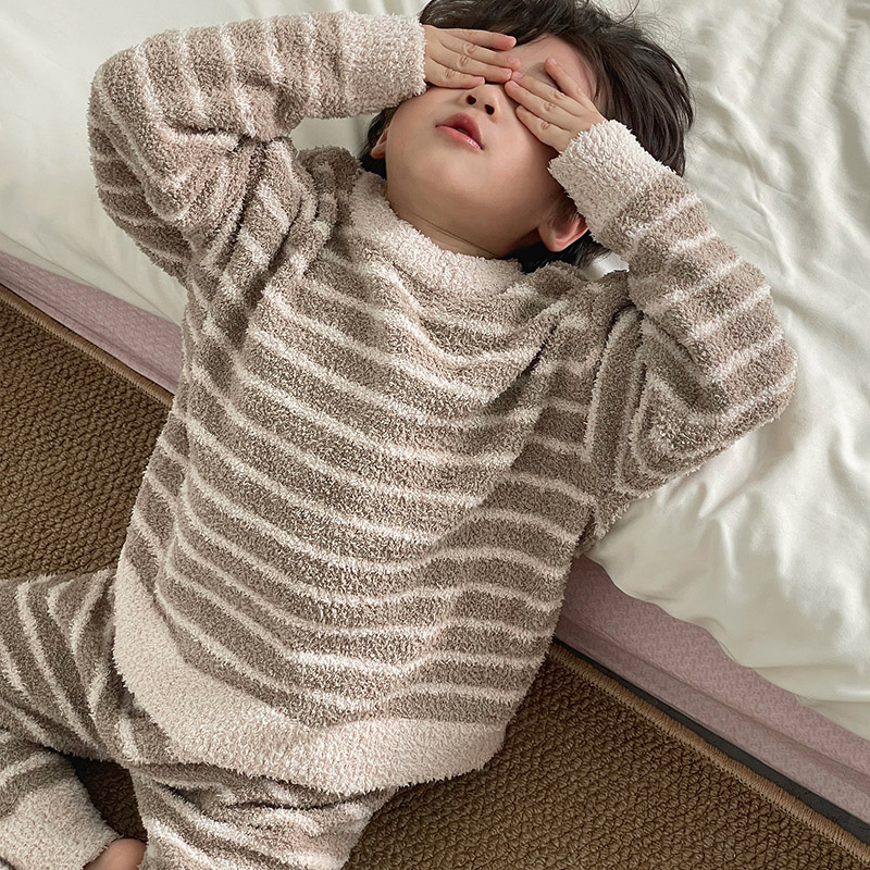 儿童撞色条纹保暖半边绒睡衣宝宝套装 男童家居服秋2025新款 时尚