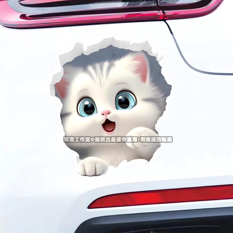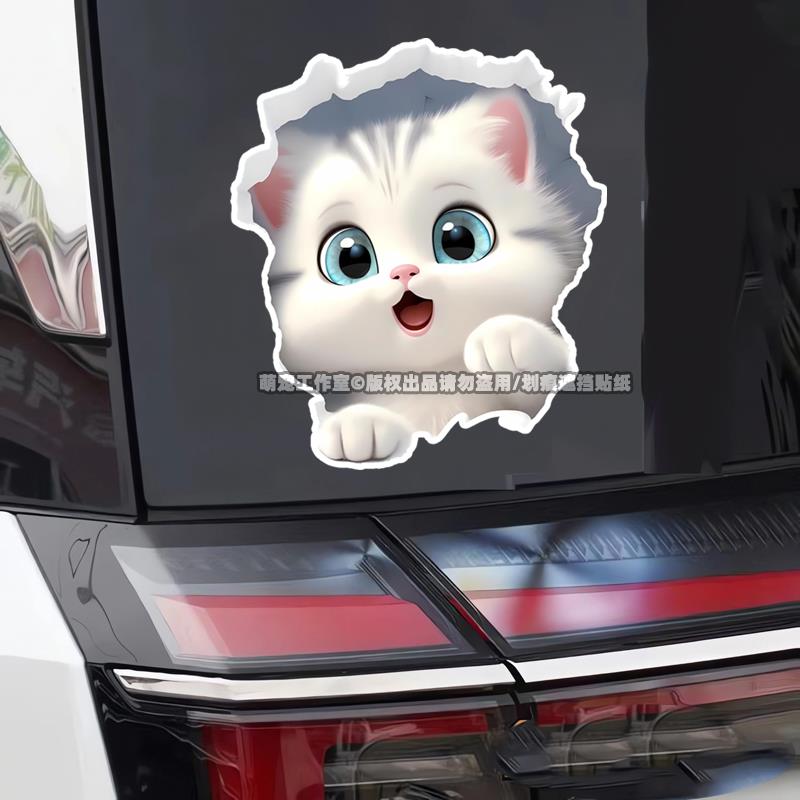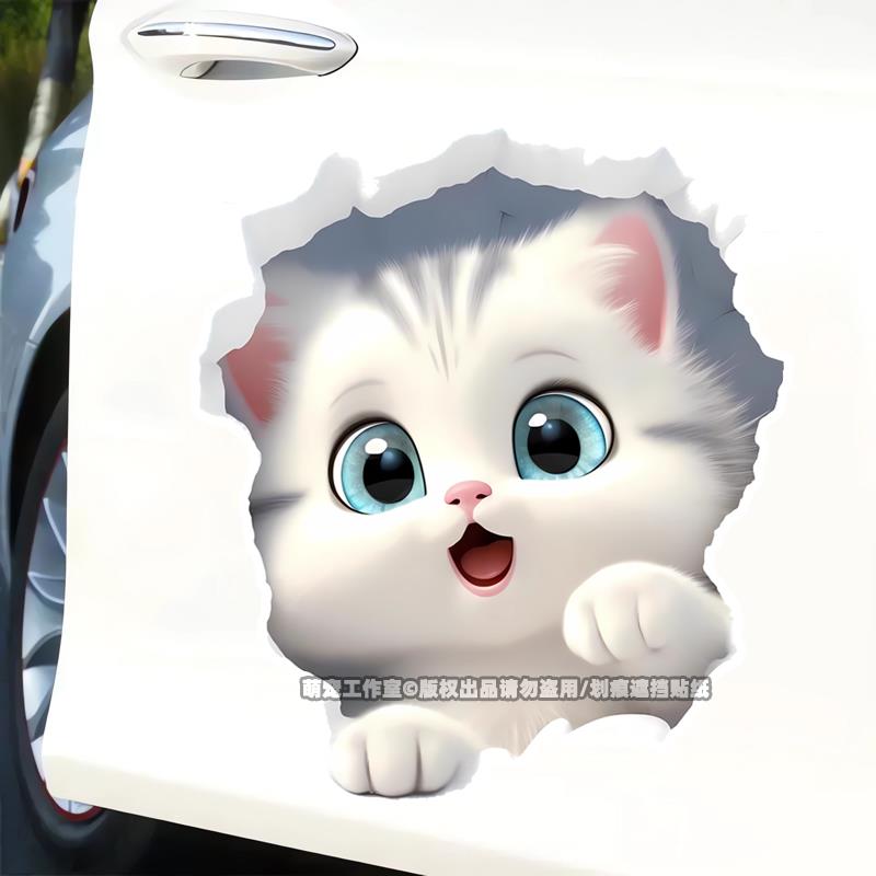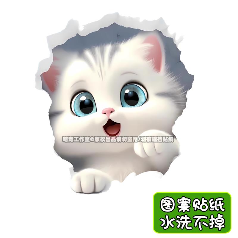 破墙小猫咪装 饰车贴纸摩托电动汽车身划痕遮挡房间马桶门墙3d贴画