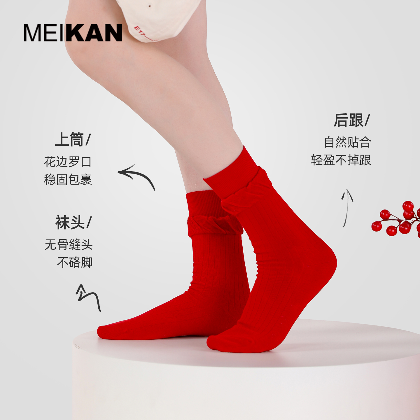 MEIKAN本命年马年红色袜子花边袜秋冬保暖长筒棉袜中筒袜堆堆袜子