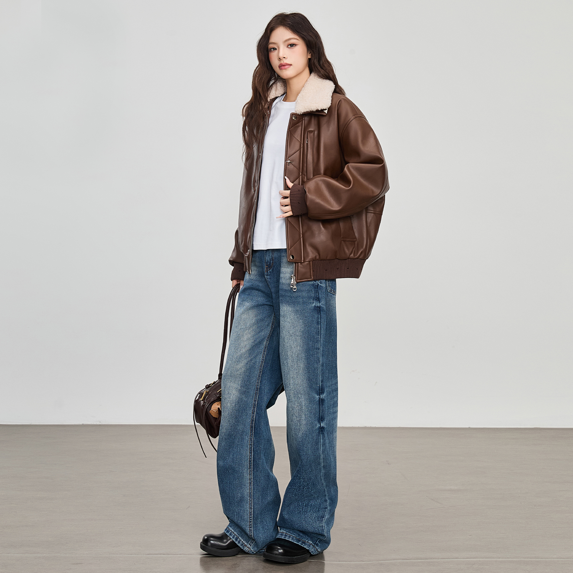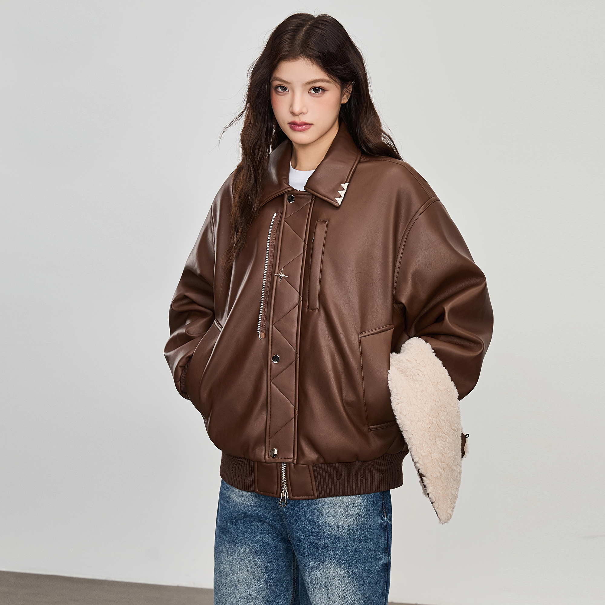情侣皮夹克外套 复古宽松机车短款 ALLIN 棕色毛领皮衣羽绒服女冬季