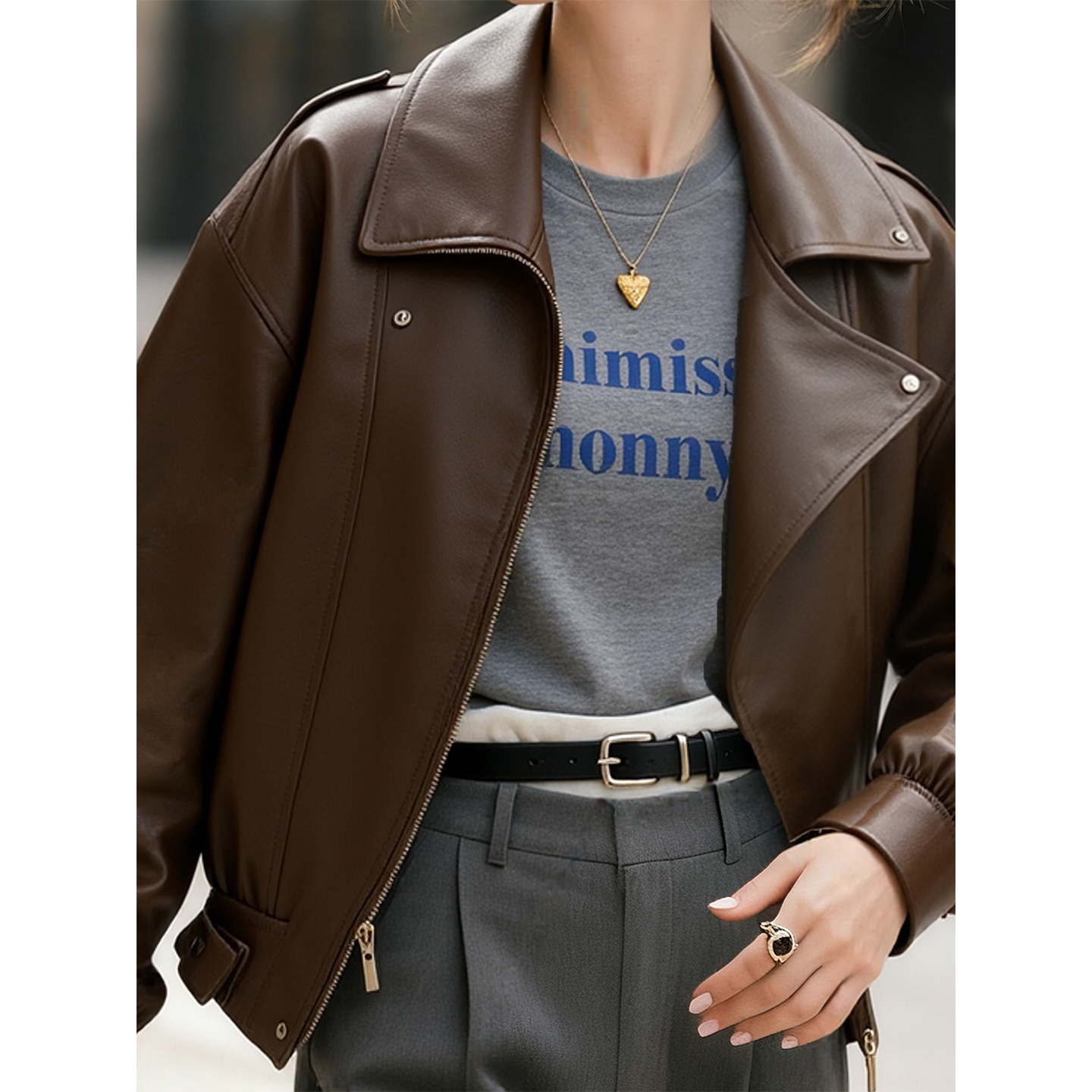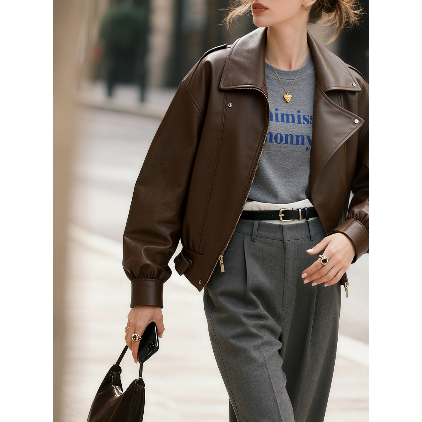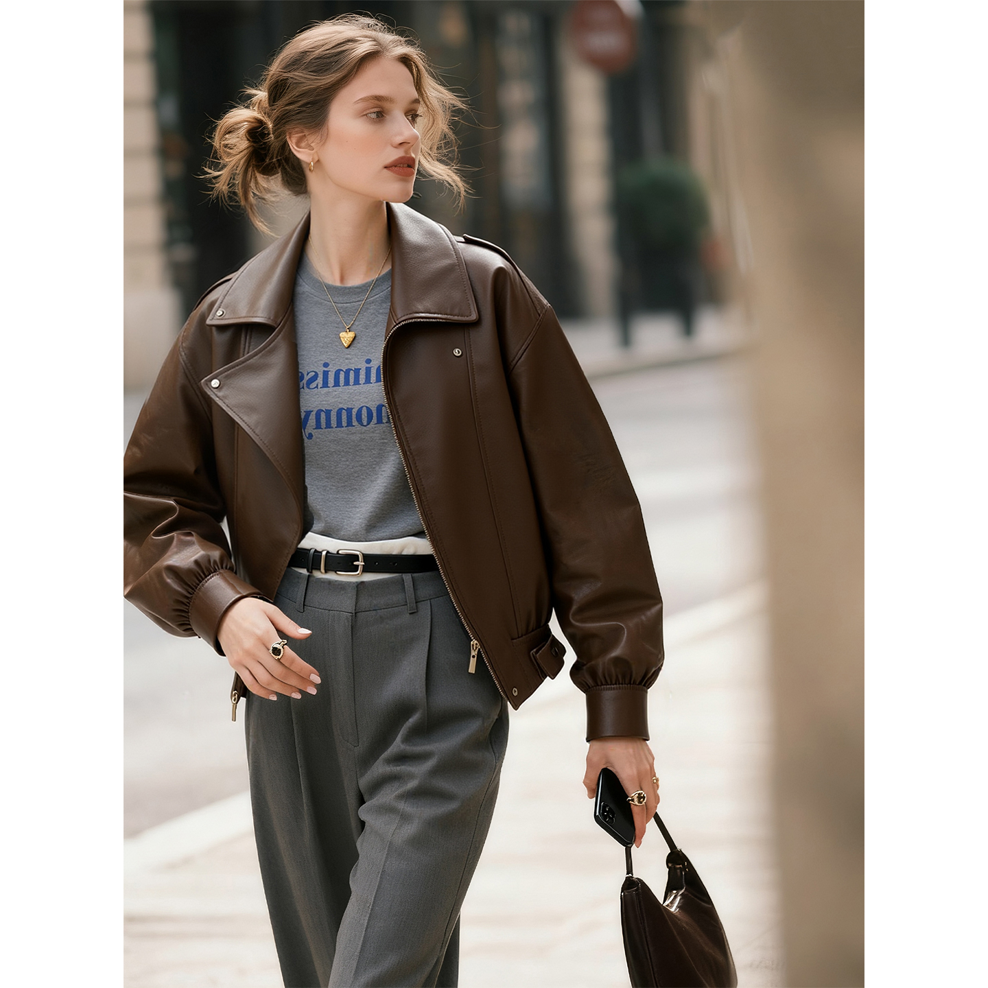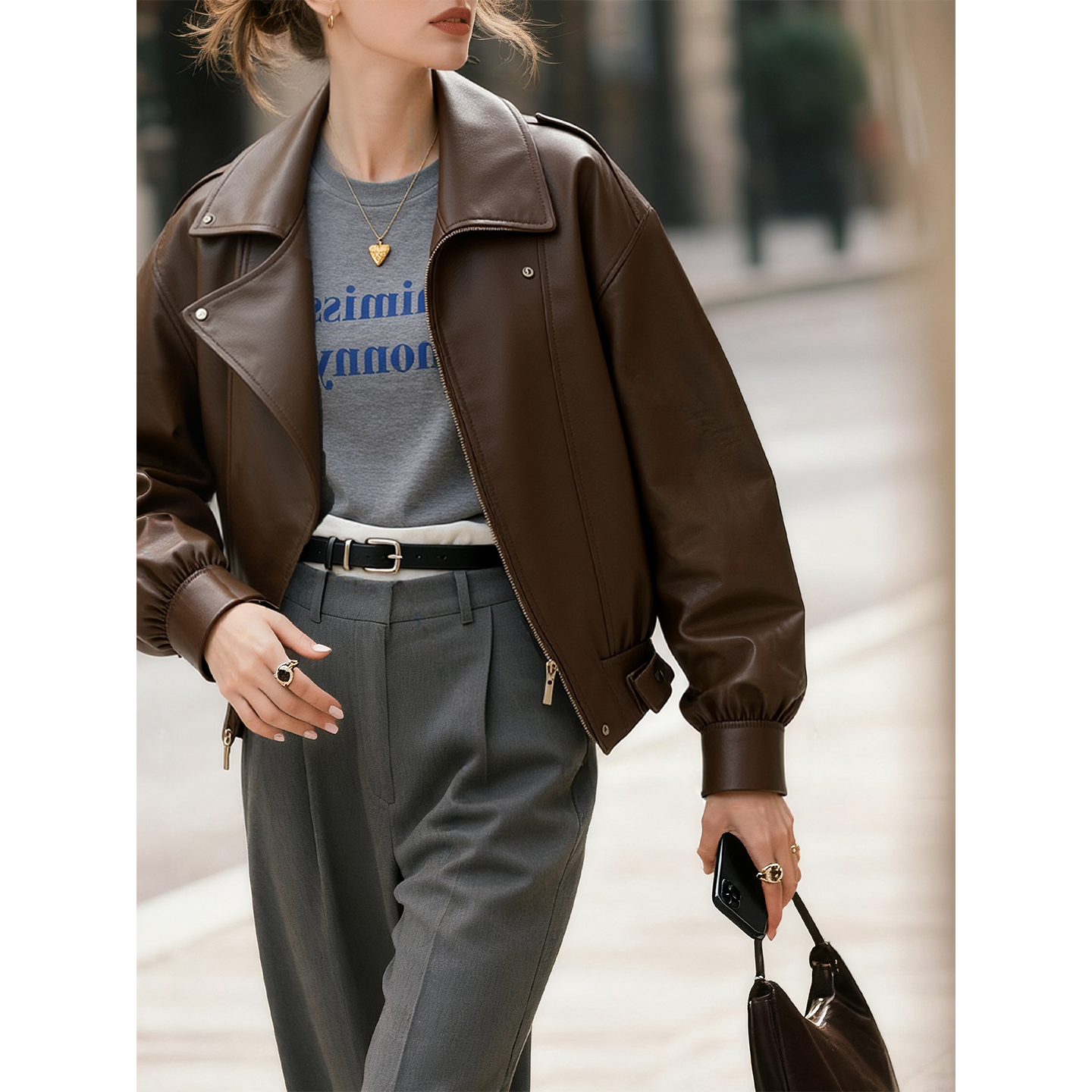 百搭机车服夹克 高级感时尚 咖色翻领短款 皮衣外套女2025年秋冬新款