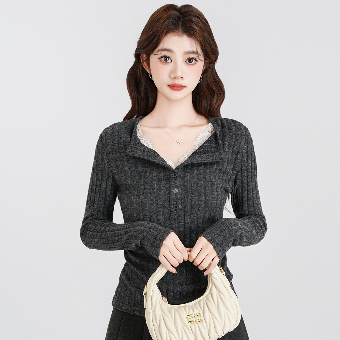 显瘦打底衫 胖MM修身 上衣 女灰色大码 洋气假两件蕾丝拼接V领针织衫