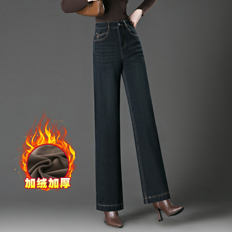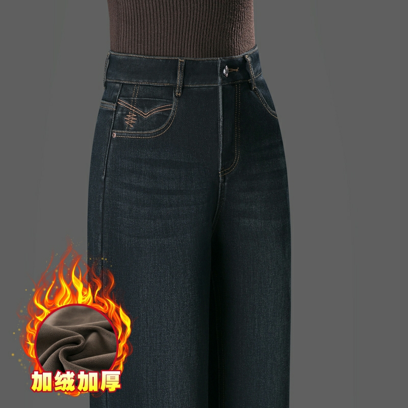 中年女裤 加绒宽松牛仔阔腿裤 高腰显腿长气质通勤遮肉 弹力时尚 窄版