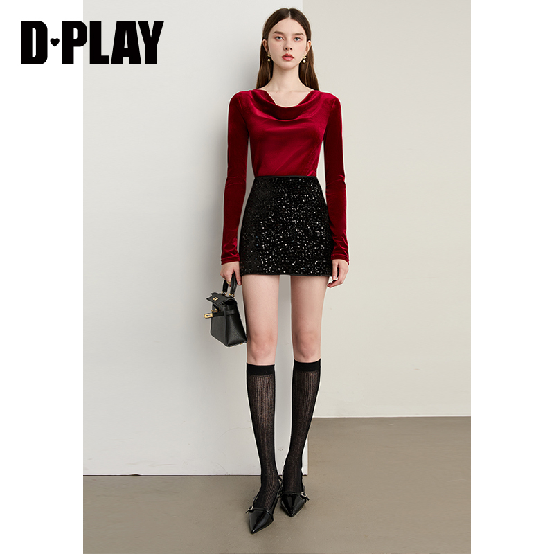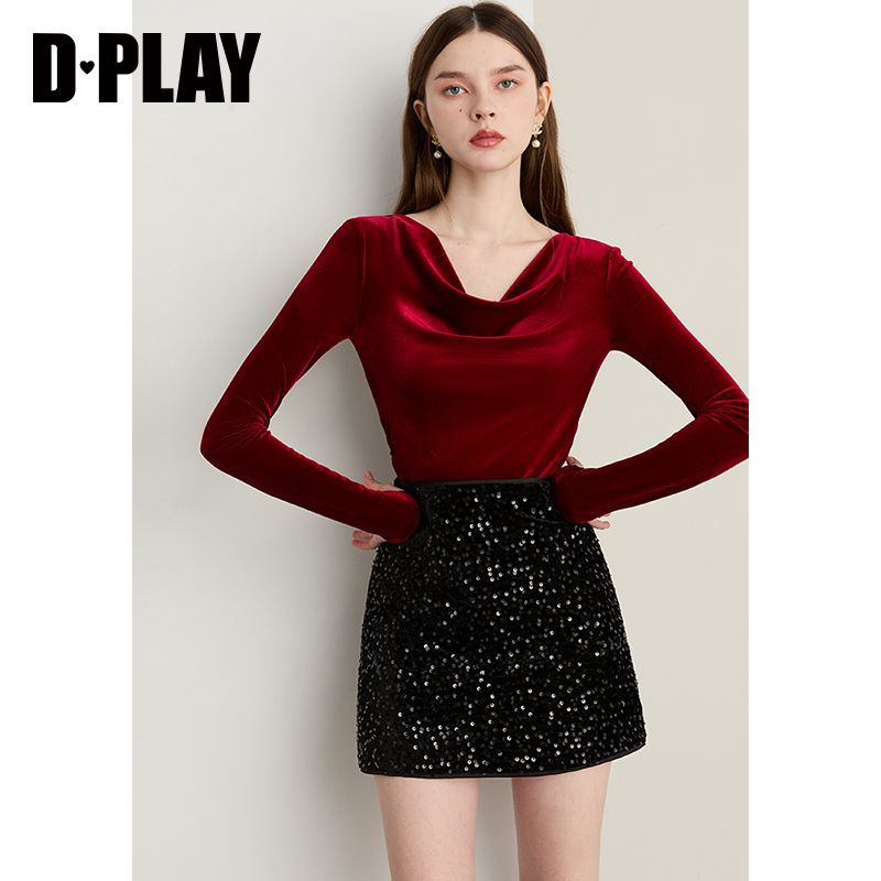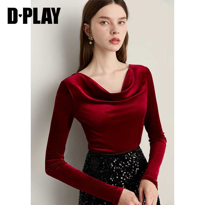 上衣 红色丝绒荡领收腰褶皱T恤女复古长袖 DPLAY2025年秋季 新款