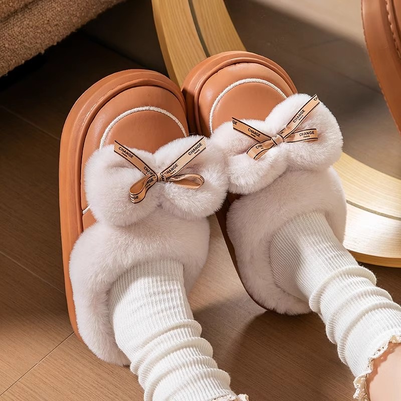 蝴蝶结秋冬居家室内可外穿包跟厚底加绒 女防水PU皮棉鞋 新款 棉拖鞋