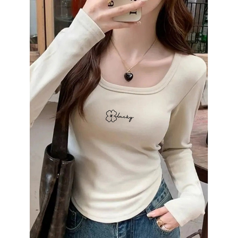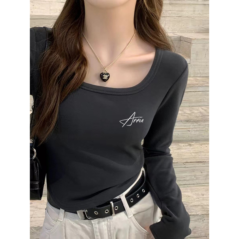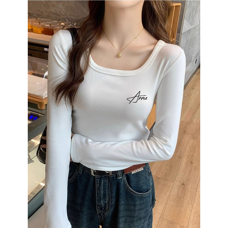 加绒短款 长袖 t恤 女士百搭上衣显瘦U领修身 秋冬方领德绒内搭打底衫