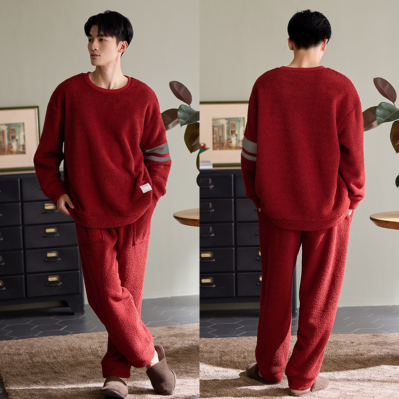 珊瑚绒家居服套装 加绒加厚可外穿红色大码 冬季 轩靓半边绒睡衣男士