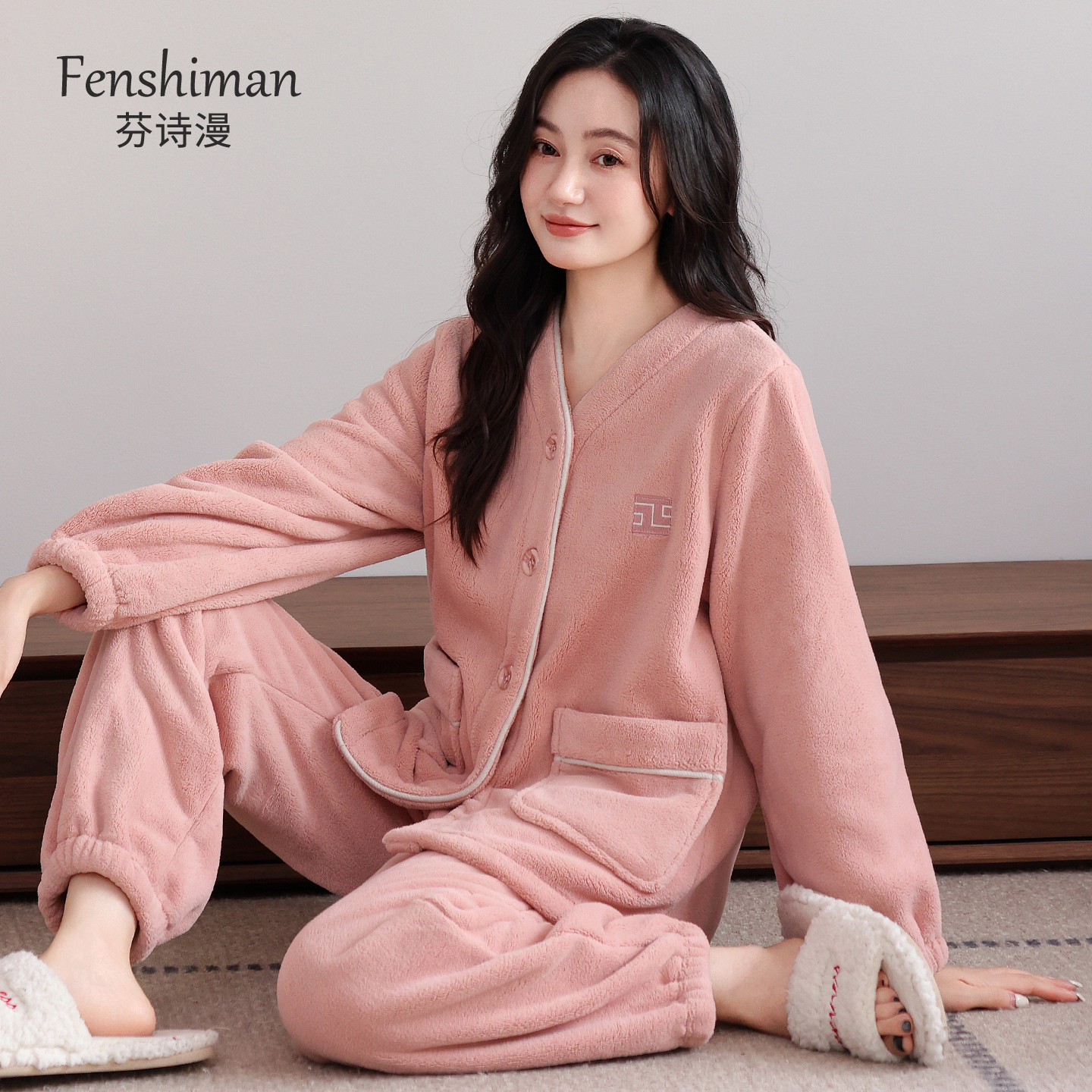 法兰绒家居服套装 芬腾秋冬珊瑚绒睡衣女保暖加厚加绒韩版 清仓