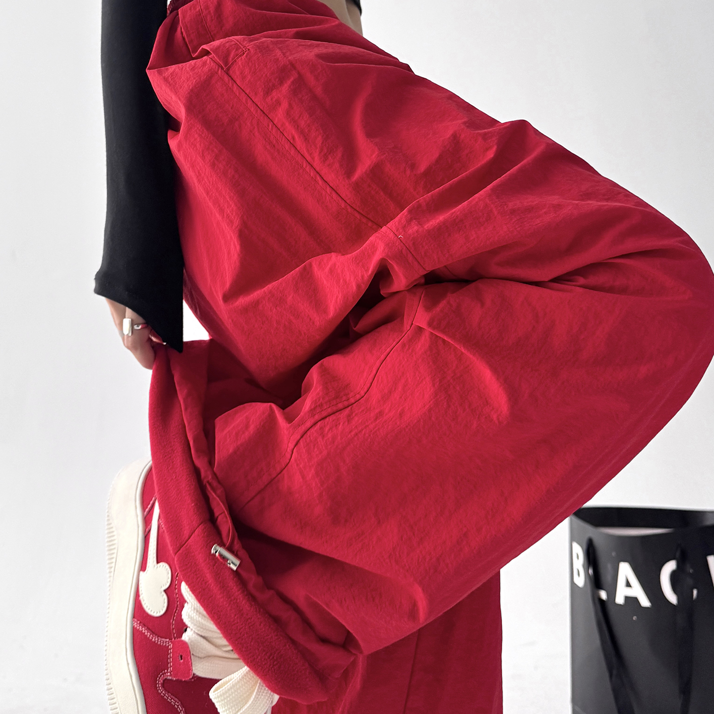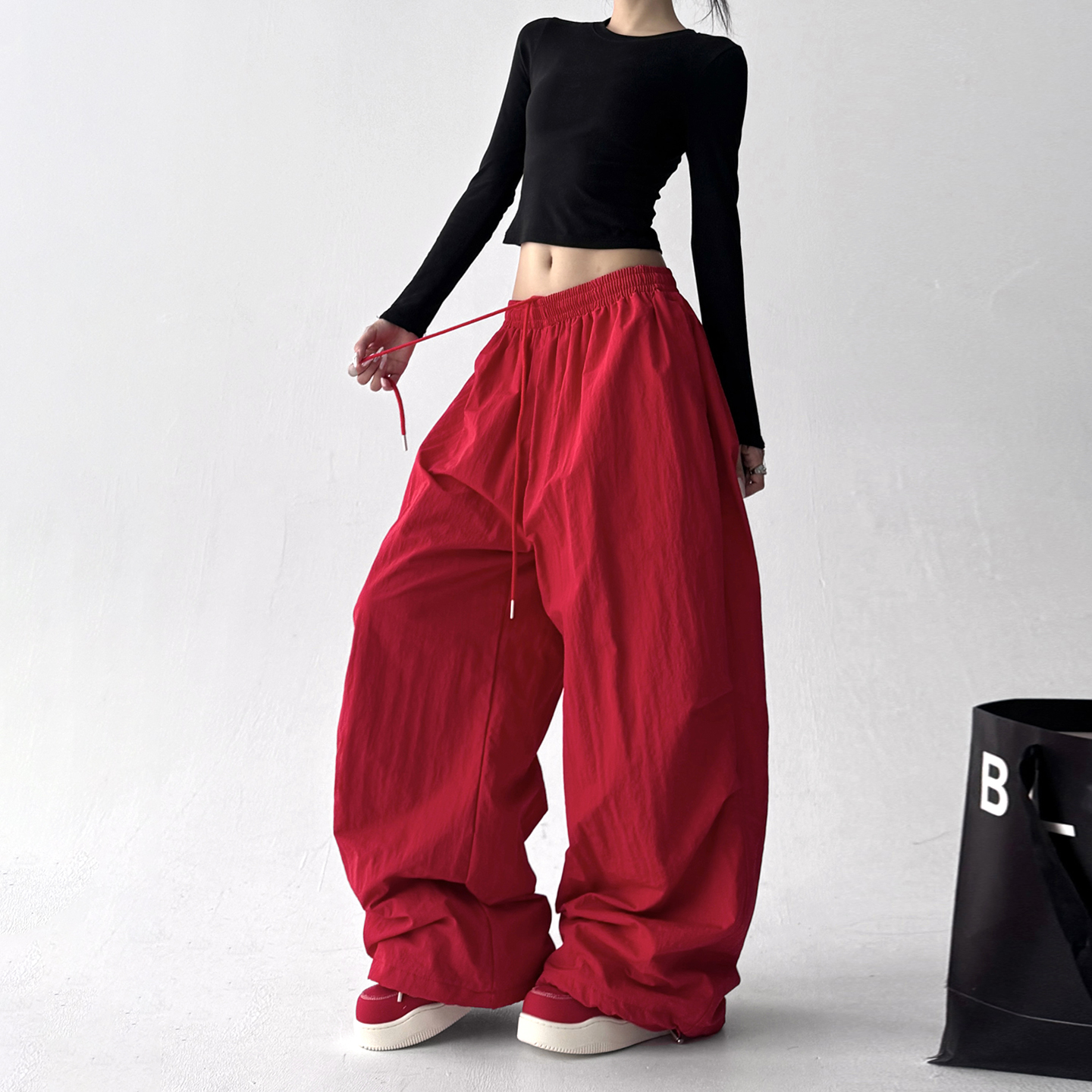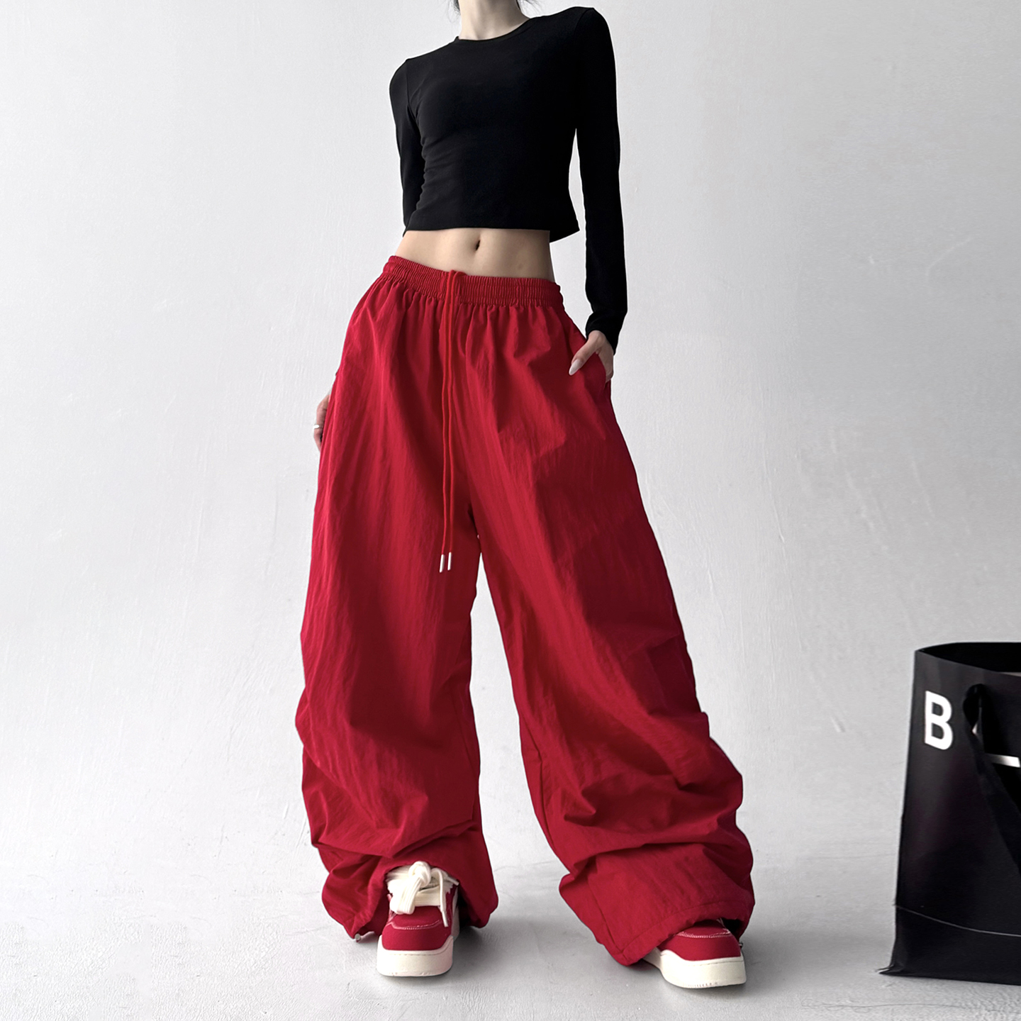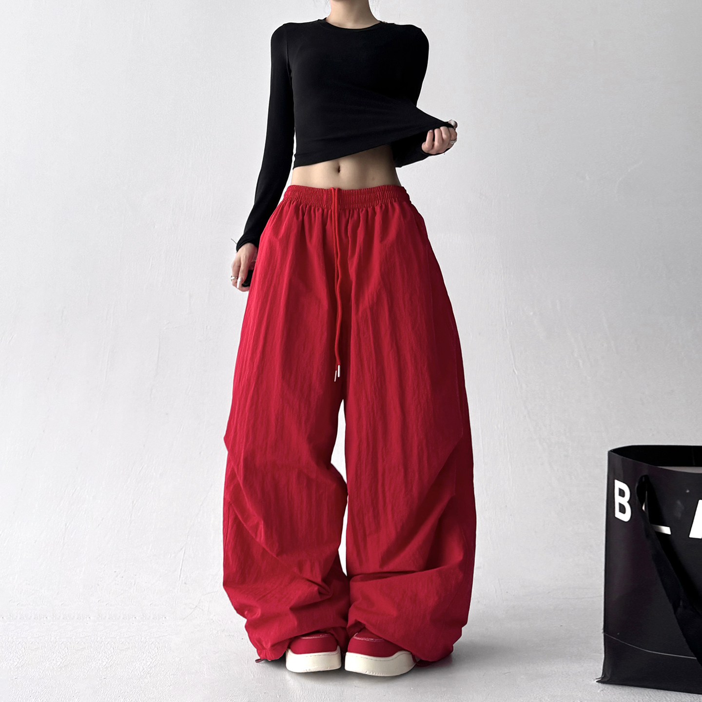 宽松慵懒风独特拖地裤 红色褶皱设计阔腿裤 休闲裤 新款 女2025秋冬装
