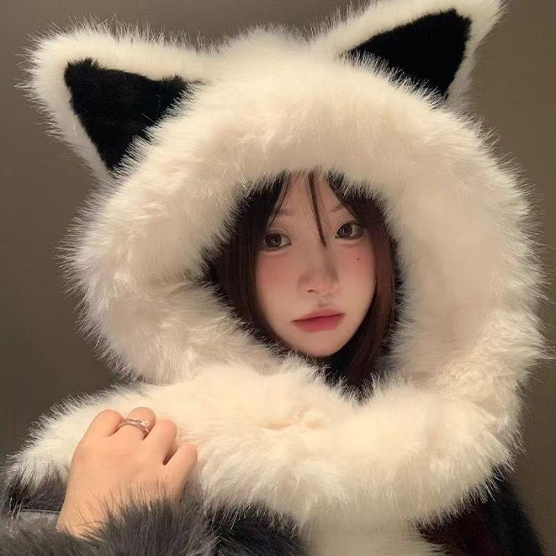 毛绒绒加厚狐狸耳朵帽子围巾一体女2025年秋冬季 保暖显脸小雷锋帽
