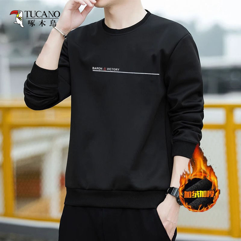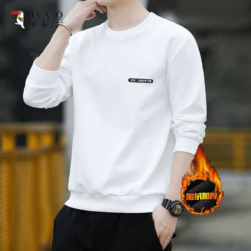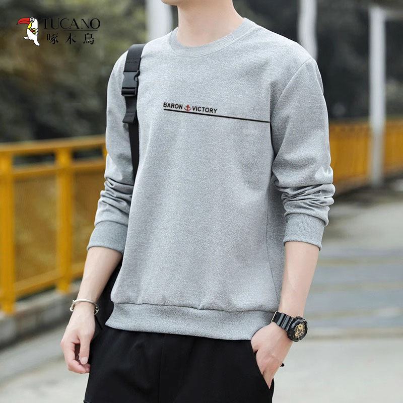 T恤 长袖 啄木鸟卫衣男春秋冬季 纯棉圆领套头印花青年加绒打底衫