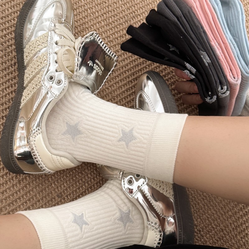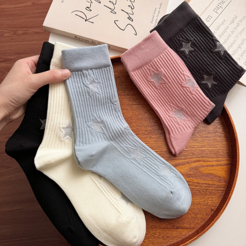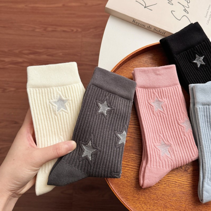 简约星星袜子女款 中筒袜ins潮春秋纯色棉长袜日系复古竖条堆堆袜