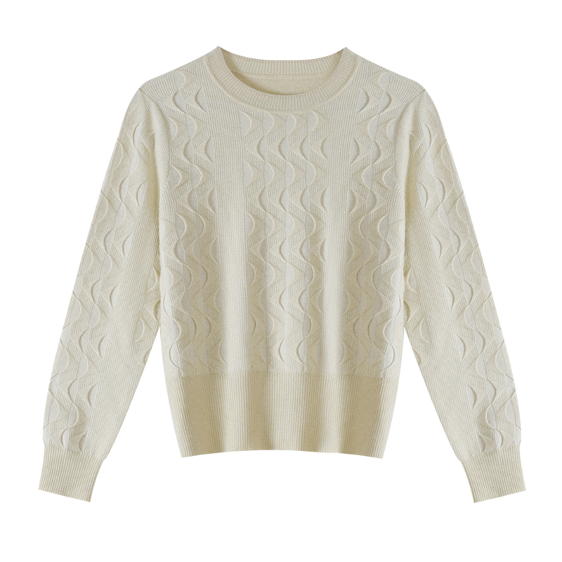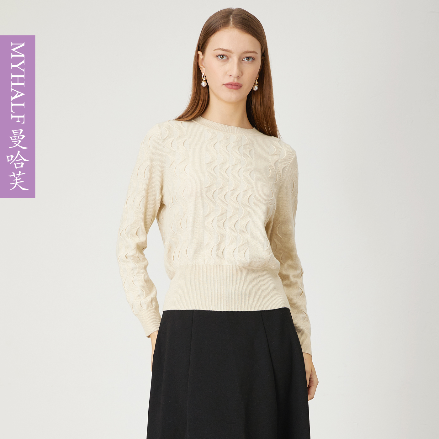 曼哈芙专柜正品 绵羊毛气质毛衣上衣 立体纹路圆领百搭针织套头毛衫