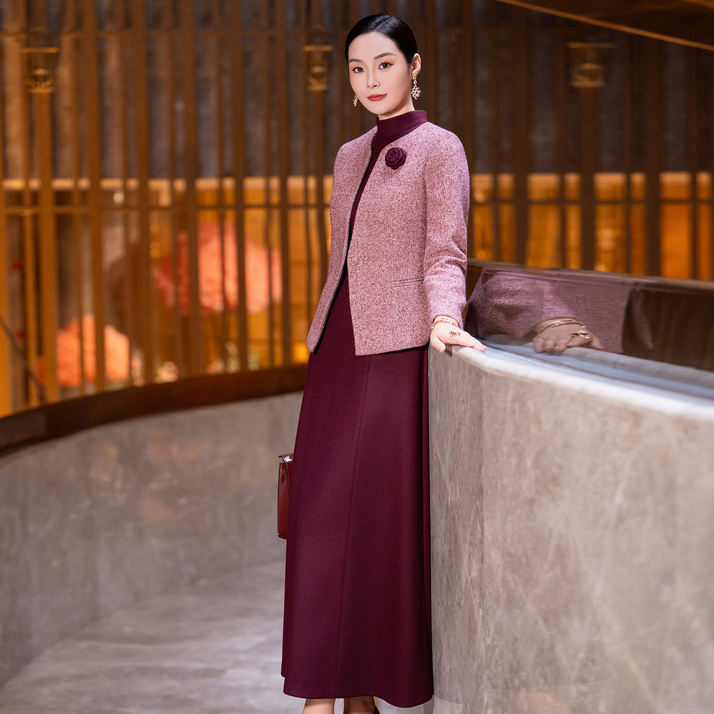 气质喜婆婆婚宴装 红色毛呢小香风套装 时尚 新款 两件套 裙女2025冬季