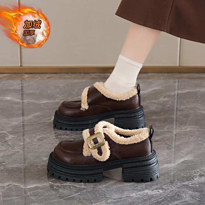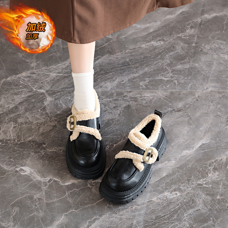女2025新款 6CM厚底粗跟JK黑色小皮鞋 爆款 加绒加厚棉鞋 冬季 乐福鞋