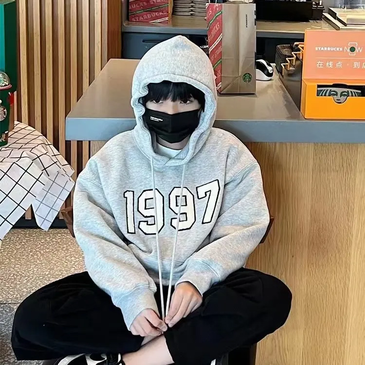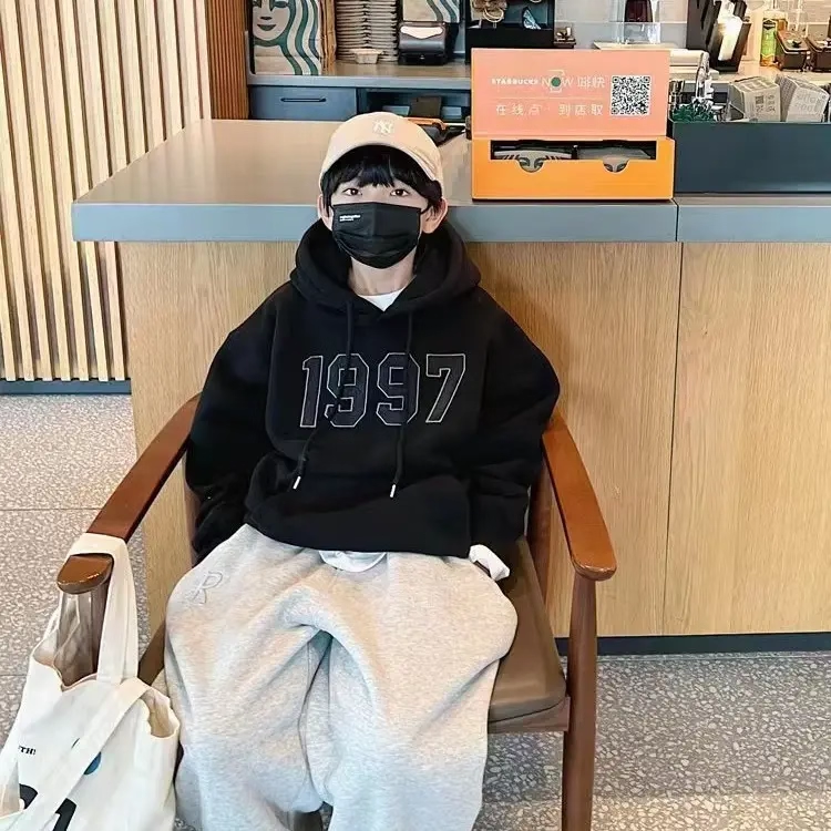 中大童字母印花连帽卫衣男女童秋冬加绒加厚潮牌高街儿童帽衫 外套