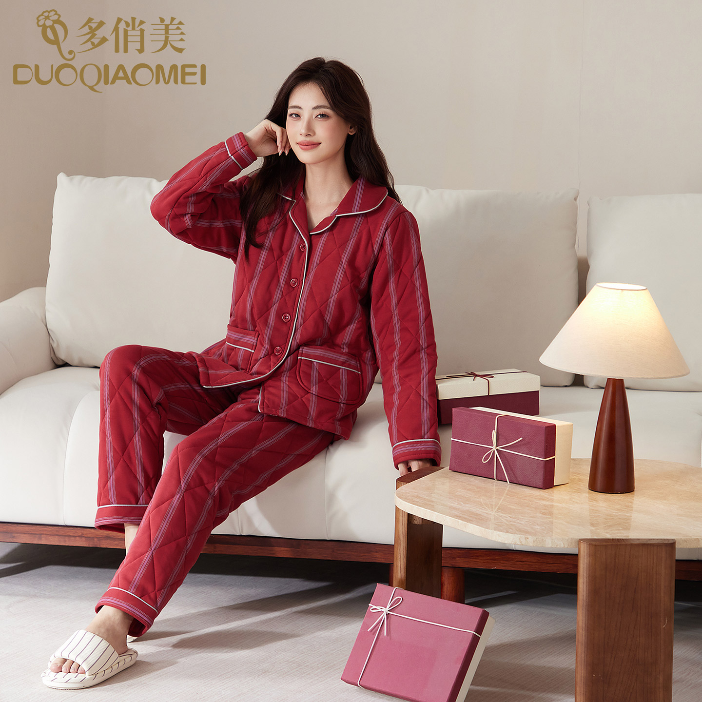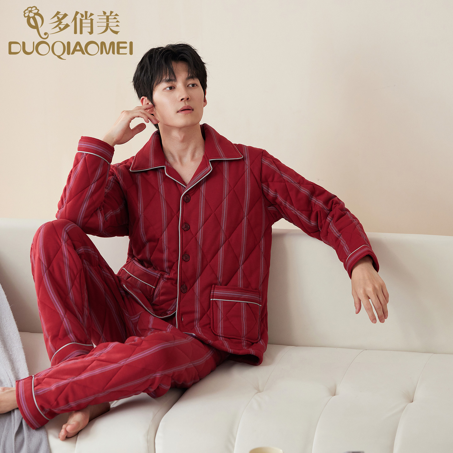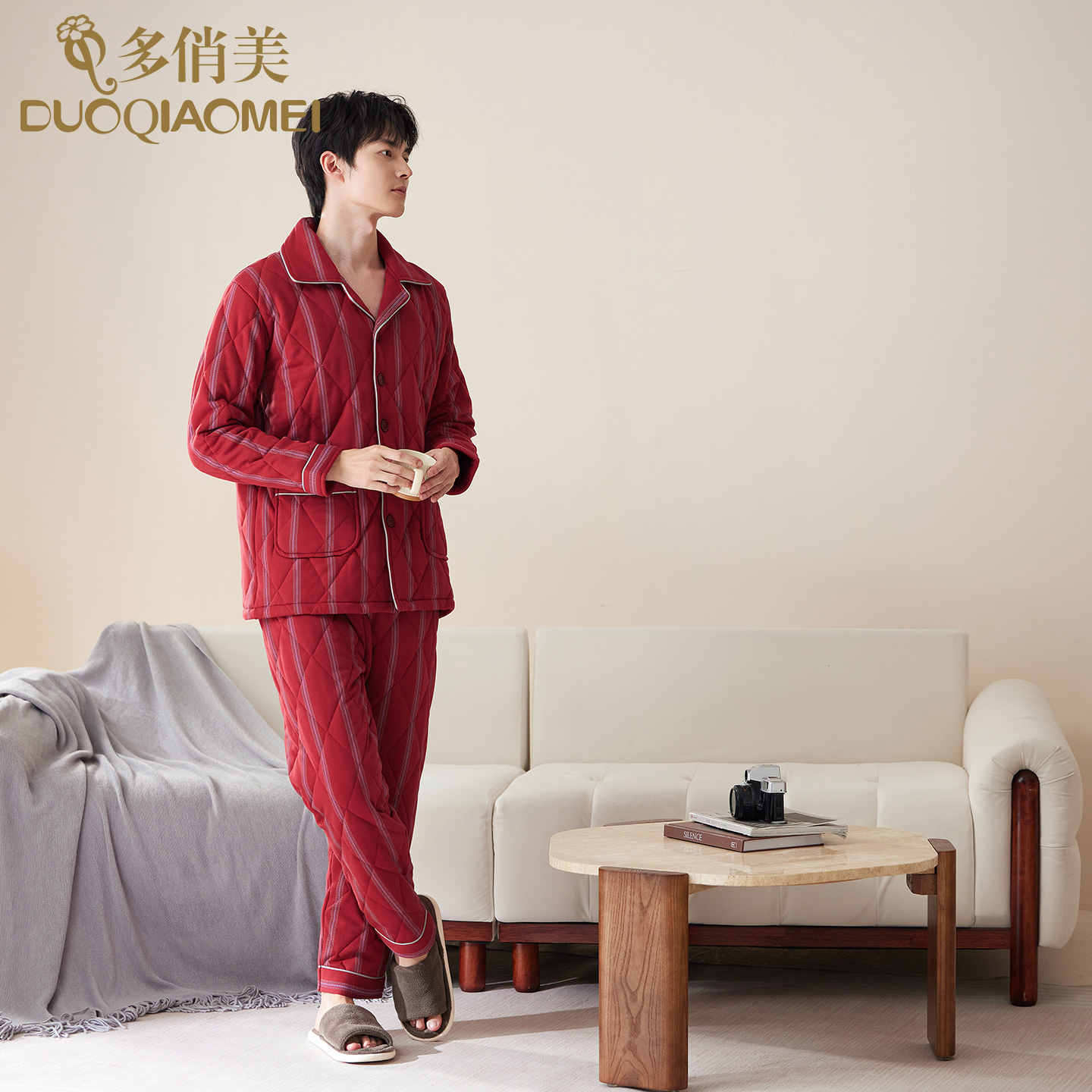 纯棉夹棉保暖加厚冬季 宽松情侣睡衣红色本命年新年结婚家居服套装