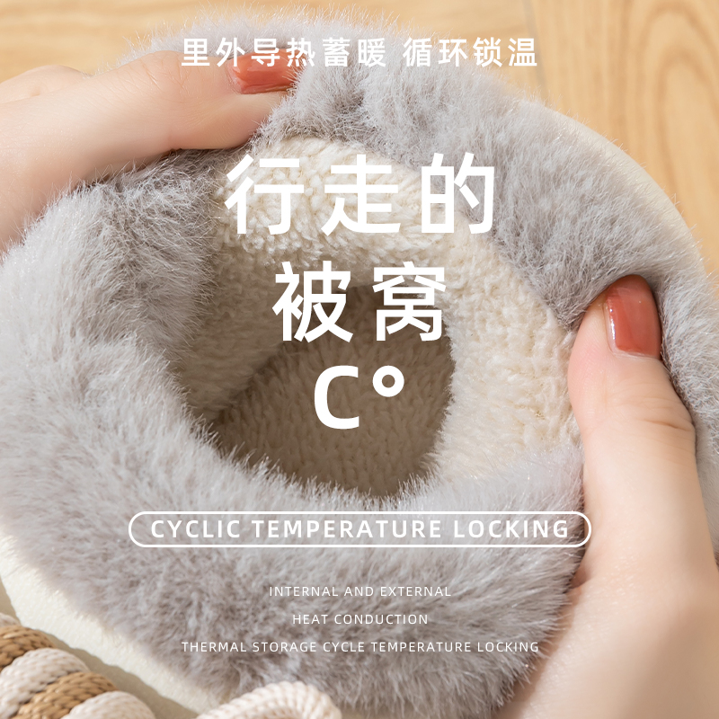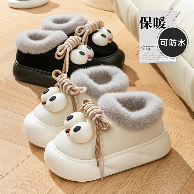 外穿厚底增高防滑通勤防水加绒保暖棉鞋 卡通大眼棉拖鞋 女包跟冬季