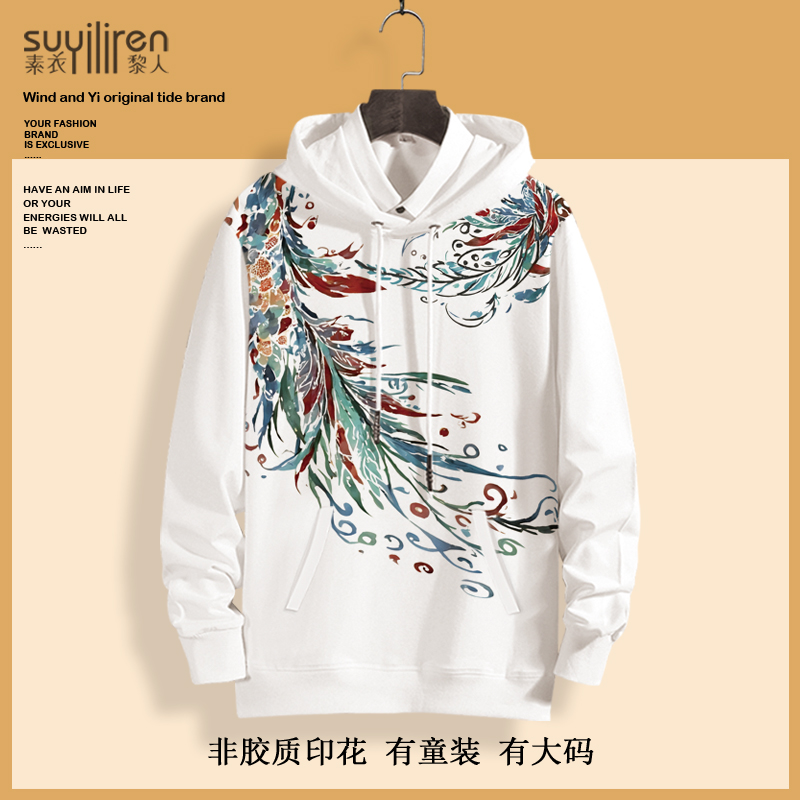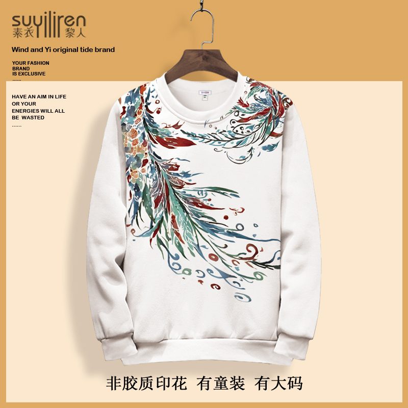 套头长袖 加肥休闲外套新款 T恤 卫衣潮牌羽毛印花圆领上衣大码 男士