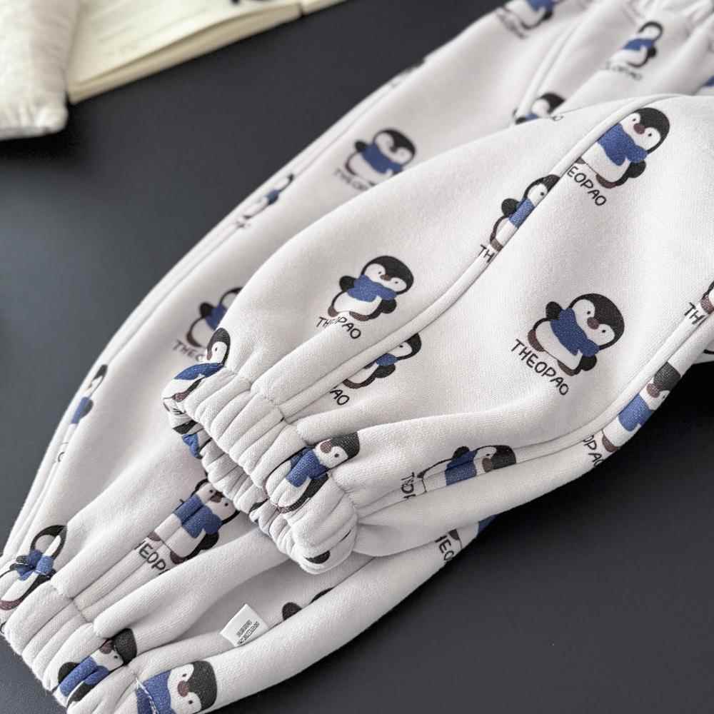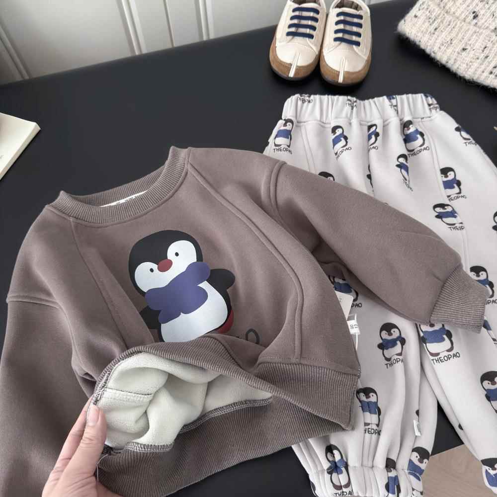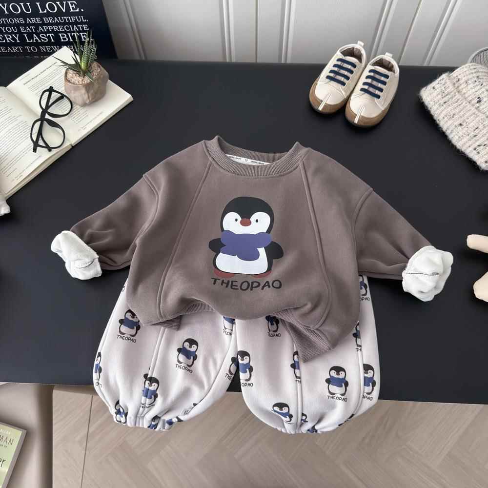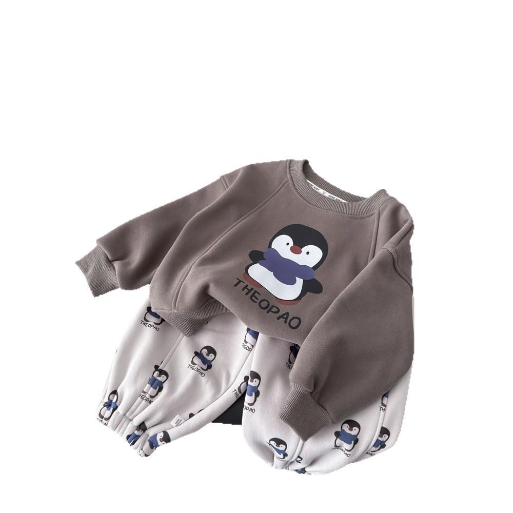 加绒儿童宝宝可爱卡通企鹅加厚卫衣休闲卫裤 2025新款 秋冬男童套装