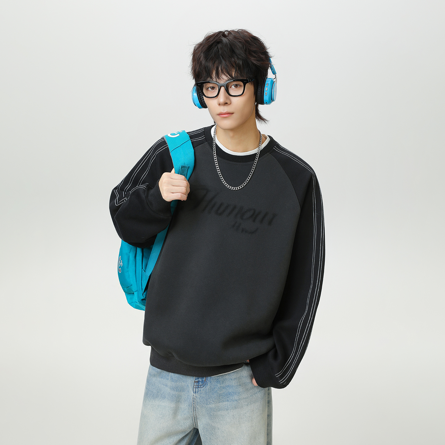 长袖 男士 重磅美式 冬季 运动印花上衣潮牌 圆领深灰色卫衣男2025新款